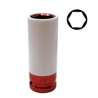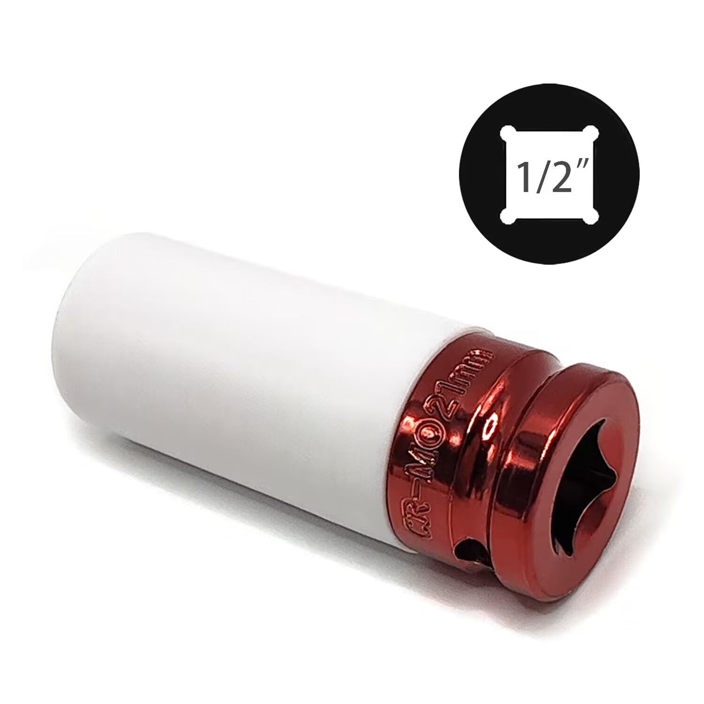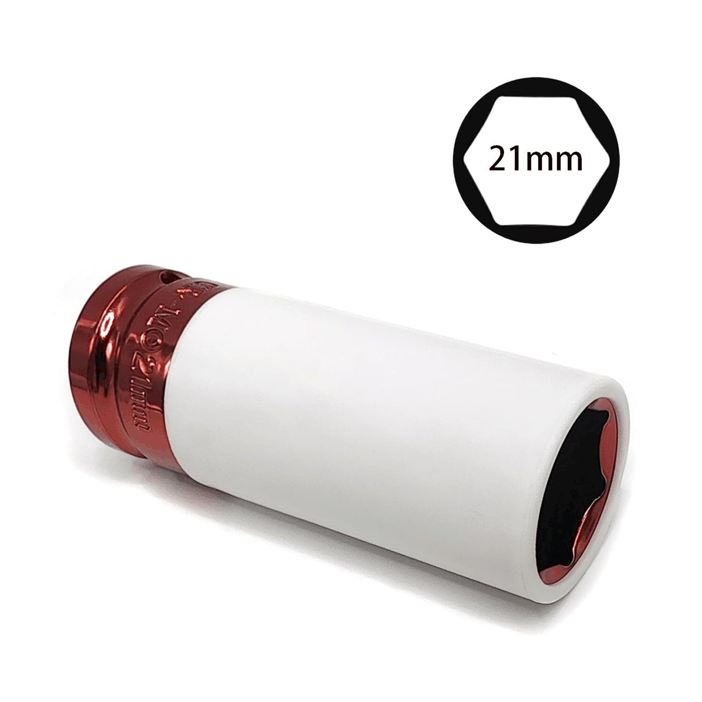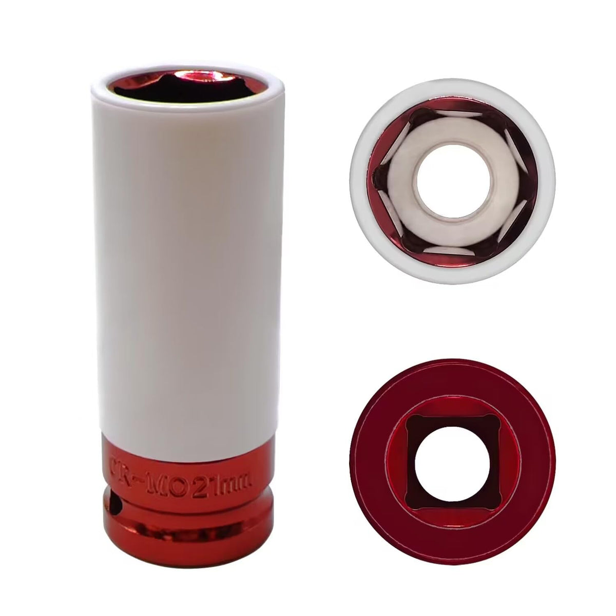 Q: What are the benefits of using the JEUCLEL 21mm 1/2" Drive Wheel Protector Impact Socket?A: The JEUCLEL 21mm impact socket is designed to prevent scratches on your vehicle's wheels during tire changes. Its thin-walled design, combined with a scratch-resistant plastic sleeve, ensures a scratch-free operation while providing exceptional strength and durability due to its CR-MO material.