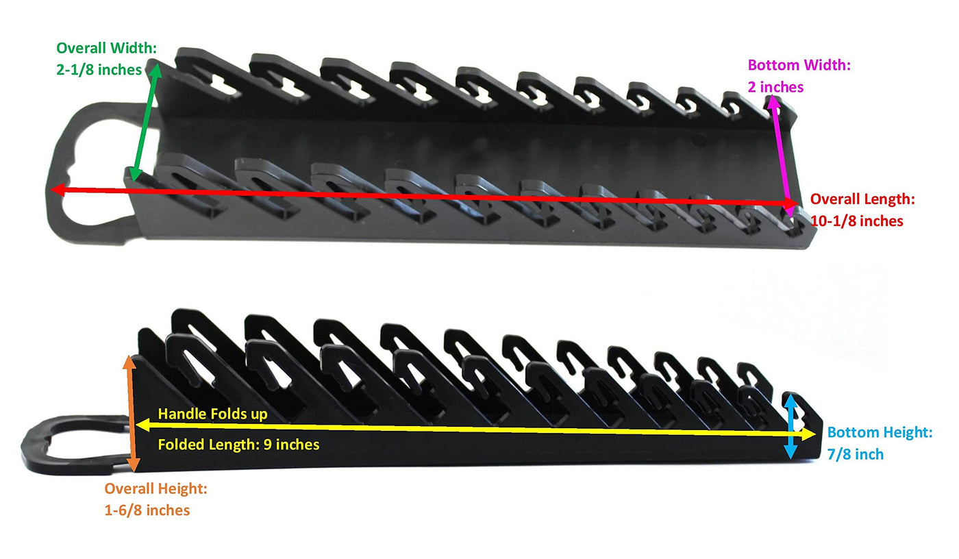 Jsp Manufacturing Plastic Portable 11-Tool Wrench Gripper Organizer Kit This Kit Comes In A Multiple Quantities & Color Choices. Please Select The Kit With The Correct Colors & Quantity Needed. The More You Buy The More You Save. Plastic Wrench Portable Gripper Organizer Tray Kit Great For Organizing And Easy Accessibility Flexible Gripping Teeth Allow For A Secure And Durable Hold And Easy Removal Grab-N-Go These Portable Organizers Are Study And Portable Carry Your Tools To The Job Site Secure In Their Slots Space Saver Foldable Handle Holds Up To 11 Wrenches Ranging From 3/8 Inch To 1Inch (Wrenches Not Included) Ideal For Toolboxes, Mobile Tool Carts, Pegboard Or Wall Storage Portable Or Can Be Installed Multiple Ways - 1. With Or Without Double-Sided Or Magnetic Tape, 2. With Screws Or Pegboard Hooks In The Convenient Screw Holes For Wall Mounting (Mounting Tape & Hardware Not Included) Made In Usa Kit Options Color - Select Correct Color Option Needed 1 Black Tray & 1 Blue Tray 1 Black Tray & 1 Red Tray 1 Red Tray & 1 Blue Tray Quantity - Select Correct Number Of Trays Needed 2 Piece Kit Includes: 2 Organizer Trays - 1 Red & 1 Blue 4 Piece Kit Includes: 4 Organizer Trays - 2 Red & 2 Blue Brand: Jsp Manufacturing Mpn: Pb-Wrenchholder-11-Tool Measures Approximately: See Images Overall Length: 10-1/8 Inches Overall Width: 2-1/8 Inches Overall Height: 1-6/8 Inches Folded Length: 9 Inches Bottom Width: 2 Inches Bottom Height: 7/8 Inch Fits: Stubby And Line Wrenches Ranging From 3/8 Inch To 1Inch - Wrenches Are Not Included Ideal For Toolboxes, Mobile Tool Carts, Pegboard Or Wall Storage See Our Additional Storage Products For Your Garage Tool Organizing Needs