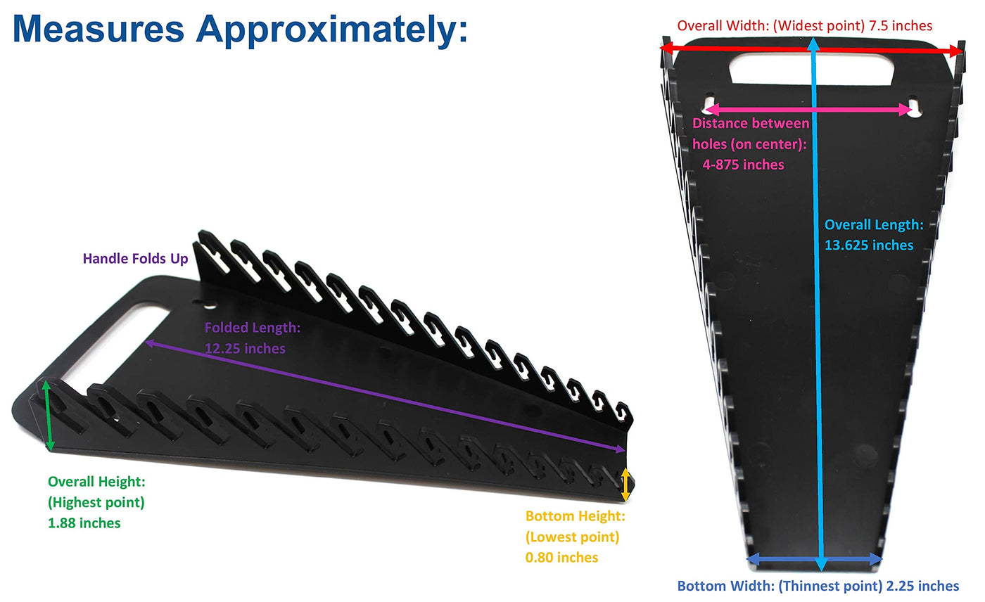 Plastic Wrench Portable Gripper Organizer Tray Kit Great For Organizing And Easy Accessibility Flexible Gripping Teeth Allow For A Secure And Durable Hold And Easy Removal Grab-N-Go These Portable Organizers Are Study And Portable Carry Your Tools To The Job Site Secure In Their Slots Space Saver Foldable Handle Holds Up To 15 Wrenches Ranging From 1/4 Inch To 1-1/8 Inch And 6Mm To 20Mm (Wrenches Not Included) Ideal For Toolboxes, Mobile Tool Carts, Pegboard Or Wall Storage Can Be Installed With Or Without Double-Sided Or Magnetic Tape, Or With Screws Or Pegboard Hooks In The Convenient Screw Holes For Wall Mounting (Mounting Tape & Hardware Not Included) Made In Usa