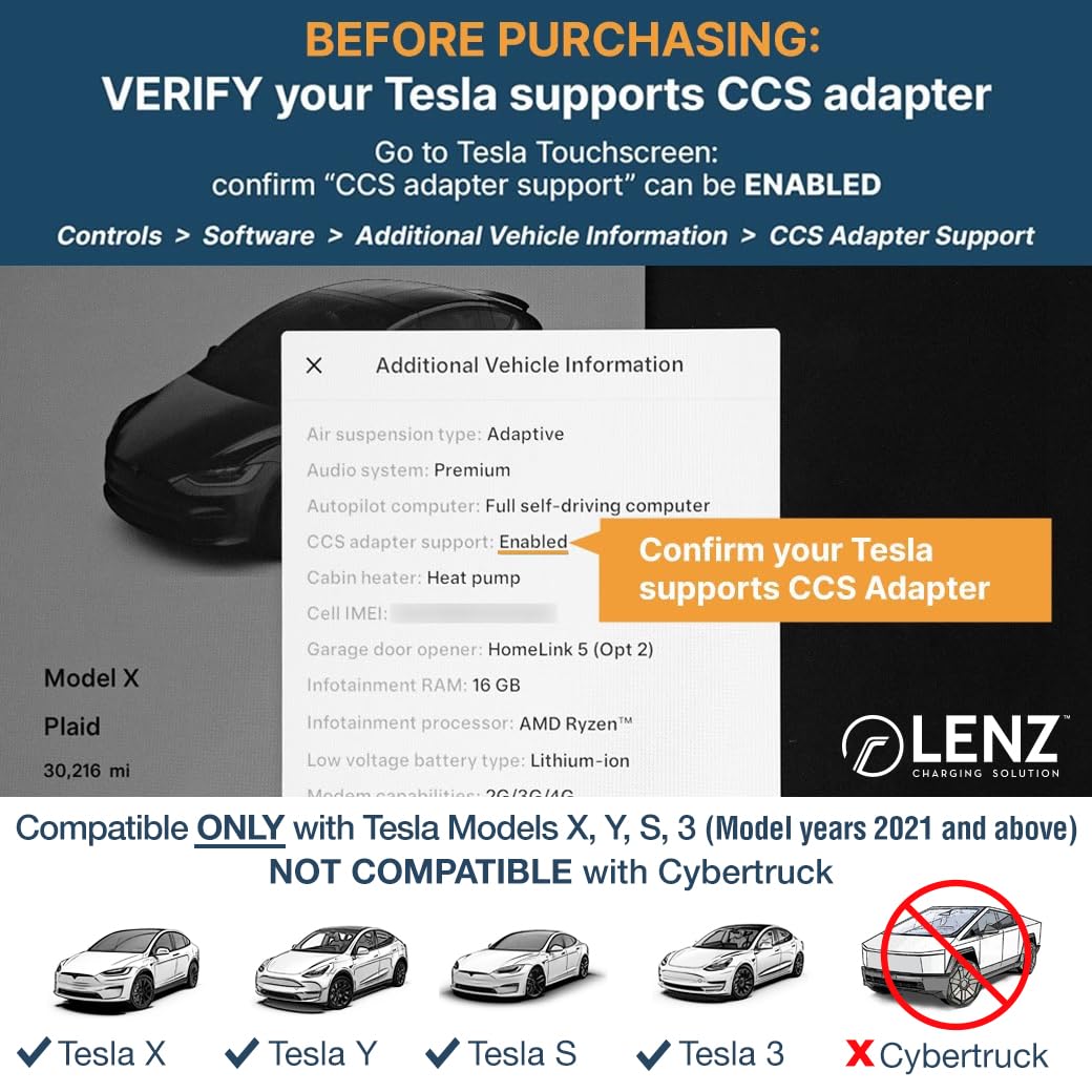 Q: What should I check before using the LENZ CCS1 to Tesla Adapter with my Tesla?A: Before using the adapter, verify that your Tesla is CCS enabled by checking the settings in your vehicle: Controls > Software > Additional Vehicle Information > CCS Adapter Support. Typically, this applies to model years 2021 and newer.