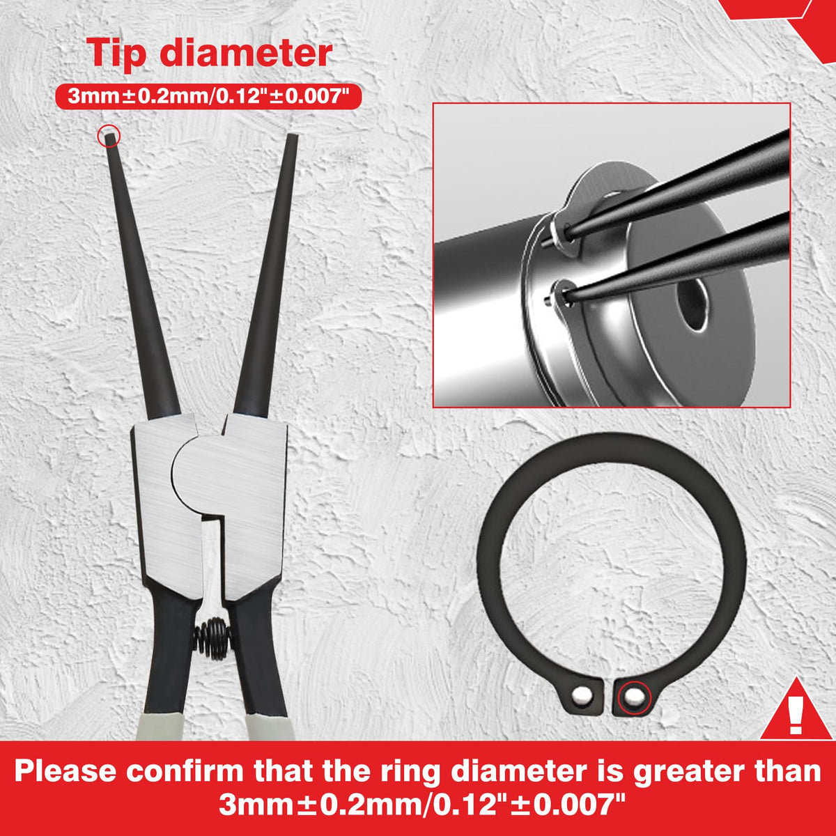 Q: What is the size and tip diameter of this snap ring plier?A: This snap ring plier measures 318 x 130mm (12.5 x 5.1 inches) with a tip diameter of 3mm ± 0.2mm.