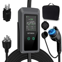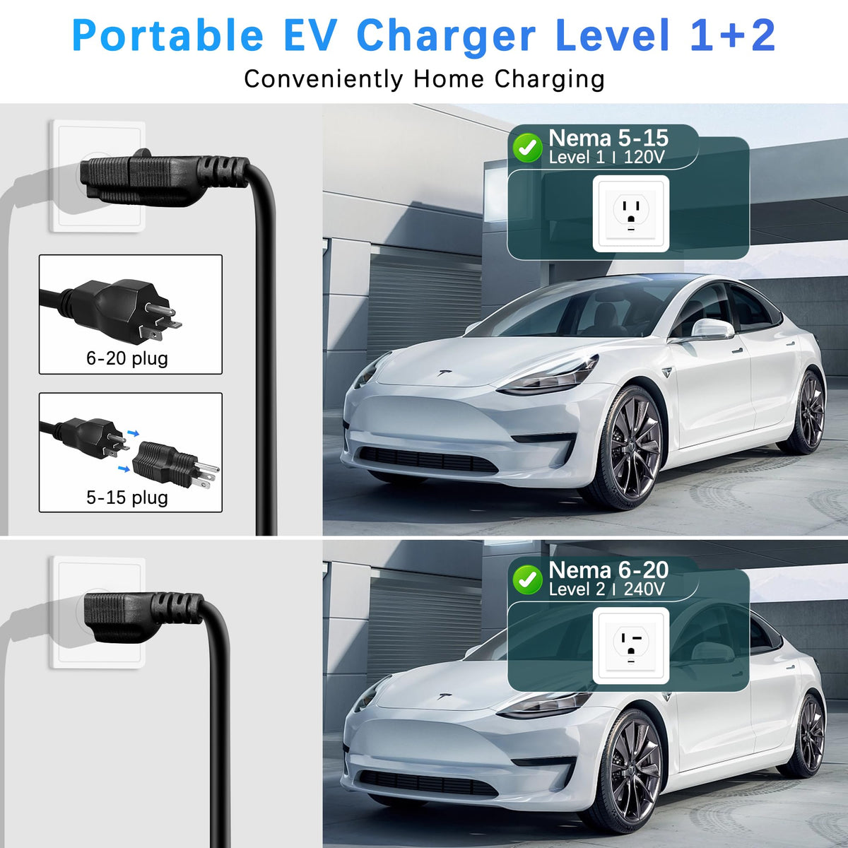 Portable EV Charger (Level 1 & Level 2) with 25ft Charging Cable, SAE-J1772 Compliant, 16A/13A/10A/8A, 110V-240V. NEMA 6-20 (220V or 240V) and NEMA 5-15 (110V). All Tesla Models require adapter utilize this charger(Adapter Not Included).