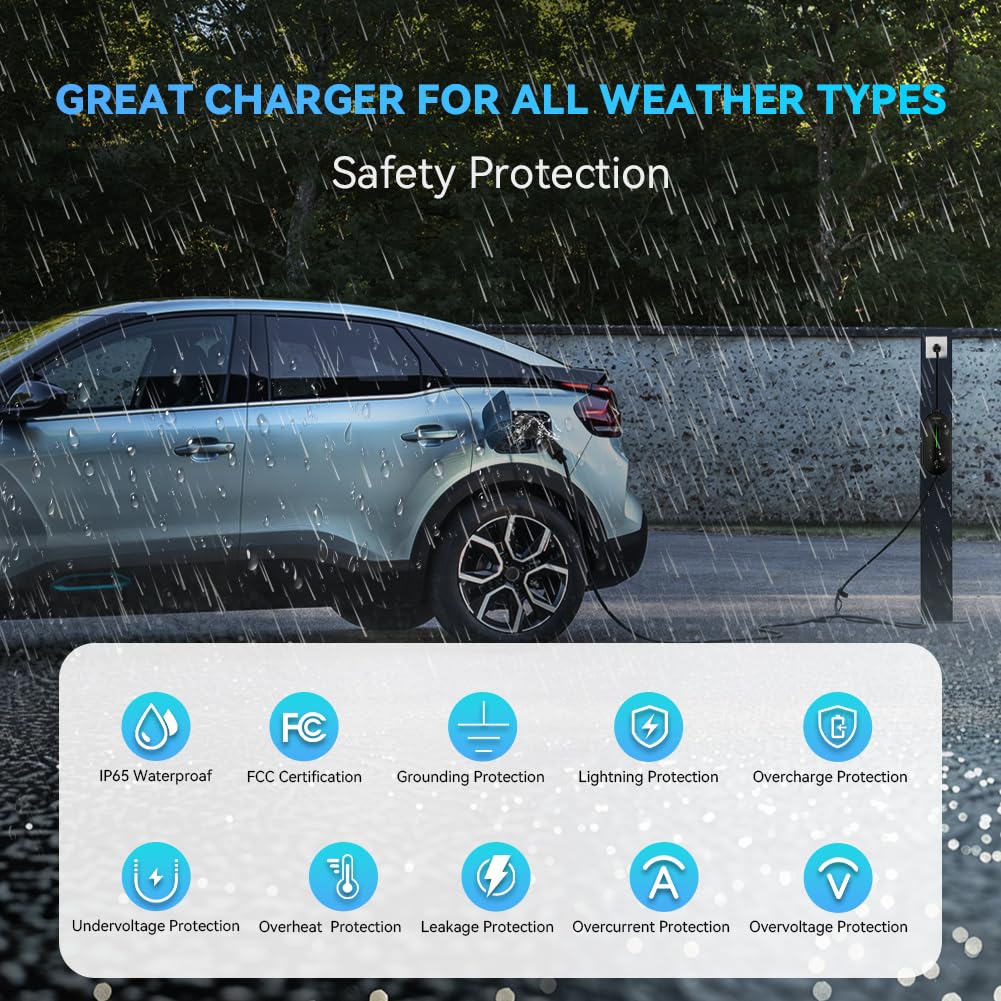 Adjustable Charging Current:Level 2 EV charger offers flexible amperage settings ranging from 8A to 16A (8A/10A/12A/16A).Allowing you to choose the right speed for your needs by simply touching the ''A'' button.When using a 5-15P Plug, need to be used with current below 16A.