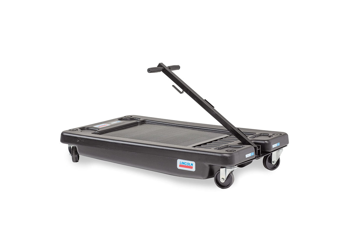 Q: Can the Lincoln 3665 Fluid Drain be used with heavy-duty vehicles?A: Yes, the convenient low-profile design, measuring 44" L x 28" W x 7.75" D, allows easy access under trucks, buses, and other heavy-duty vehicles, making it suitable for fleet maintenance and service shops.
