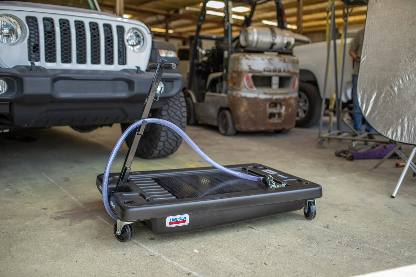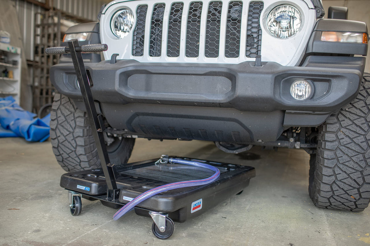 Lincoln 3665 17 Gallon Low Profile Truck Drain For Collection Of Used Fluids, 7.75 In. Tall With 6 Ft. Discharge Hose With 3/4 I