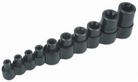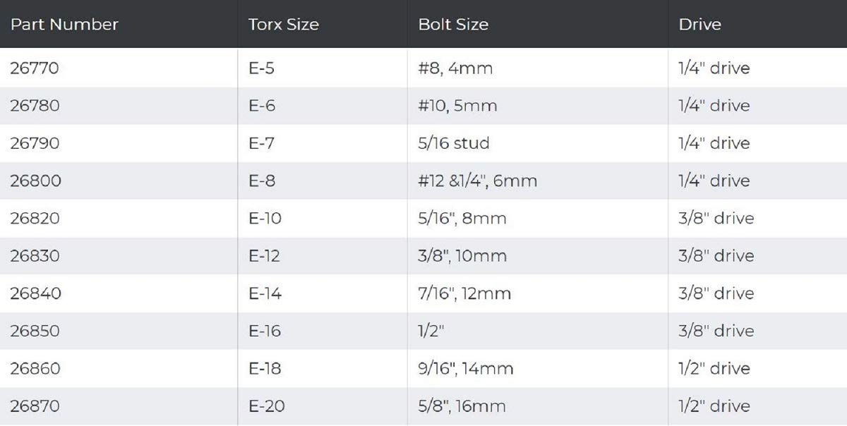 Q: What sizes are included in the Lisle 26280 Torx Socket Set?A: The Lisle 26280 Torx Socket Set includes 10 sizes ranging from E5 to E20, making it versatile for various external Torx bolts.