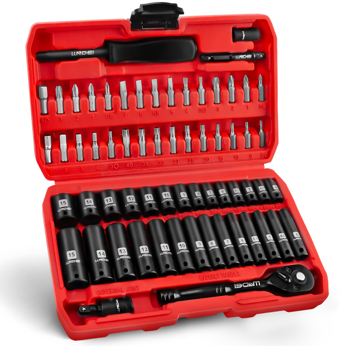 Q: What sizes of sockets are included in the LLNDEI 1/4" Drive Socket Wrench Set?A: The LLNDEI 1/4" Drive Socket Wrench Set includes deep and shallow metric sockets ranging from 4mm to 15mm, providing a versatile selection for various automotive and household repairs.