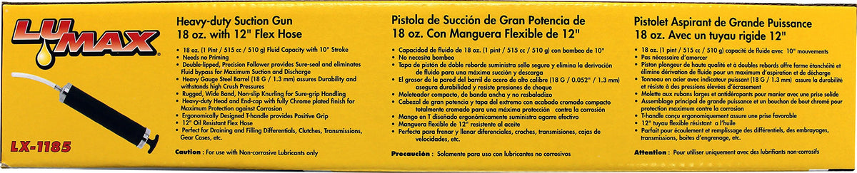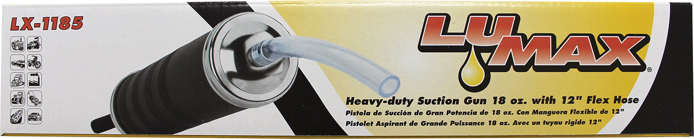 This is a heavy-duty, suction gun with 12 inches oil and UV resistant flex hose. It is excellent for draining and filling transmissions, differentials, clutches, gear cases, etc. It has an 18 ounce fluid capacity with a 10 inches stroke. It needs no priming and has a double-lipped, precision follower to provide a sure seal and eliminates fluid bypass for maximum suction and discharge. The rugged, wide band, non-slip knurling for sure-grip handling. The heavy duty head and end-cap have chrome plated finish for corrosion resistance. It is for use with non-corrosive lubricants only. Lumax is a manufacturer of lubrication and fluid management products. Our products, including grease guns, manual and electric pumps, funnels, drains, grease fittings, filter wrenches, and accessories, are built to the highest standards and incorporate many proprietary features. Lumax's mission is to provide professionals and consumers with innovative and high-quality products to get the job done right. Product development at Lumax goes beyond the physical product, to a deeper understanding of the end-users' needs. Engineered with the ''user-in-mind, '' Lumax products are built to the highest standards and incorporate many unique features that make work easier, faster and cost-effective. We have a passion for the design process. We listen to our customers and their ever-expanding requirements. Our unique products lead the field in design, quality, and performance.