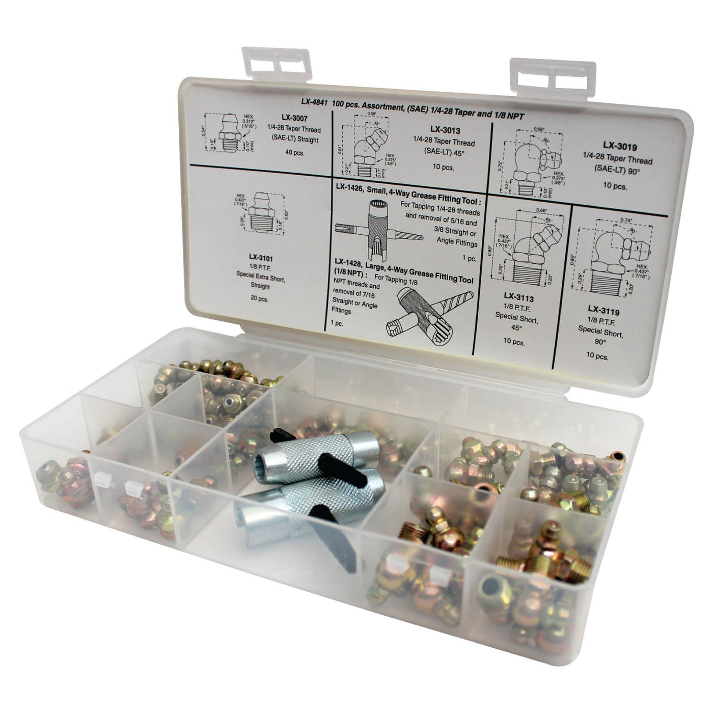 Lumax Lx-4841 Gold/Silver (Sae) 1/4'-28 Taper And 1/8' P.T.F. 100 Piece Grease Fitting Assortment. Designed To Meet The Demanding Requirements Of Most Automotive, Agricultural, Industrial