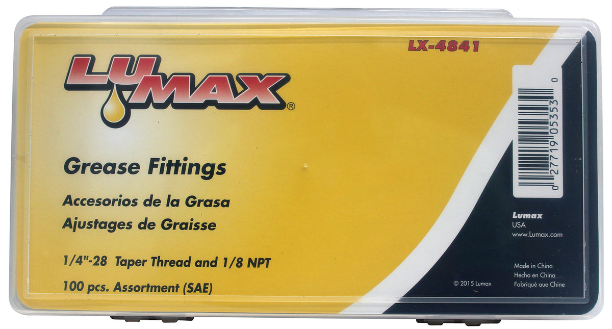 Designed To Meet The Demanding Requirements Of Most Automotive, Agricultural, Industrial, Marine, Truck, Federal, And, Construction Equipment Needs. Lumax Lx-4841 Gold/Silver (Sae) 1/4'-28 Taper And 1/8' P. T. F. 100 Piece Grease Fitting Assortment. Fully Hardened For Extra Durability And To Protect Them From Wear Due To Constant Use. Ball Check In The Head Prevents Dirt And Grit From Getting Into The Fitting. Heavier Wall Thickness For Extra Strength. Every Fitting Is Individually Inspected And Batch Tested To 5, 000 Psi. Thread Rolled Taper Threads Are Stronger And Durable Due To Hardening And Toughening Of Threads. This Is Not Achievable In A Cut Thread Process, As The Threads Become Brittle On The Periphery. Dome Type Riveting Completely Covers The Spring Enabling The Spring To Be Firmly Secured In Its Place. Lumax Is A Manufacturer Of Lubrication And Fluid Management Products. Our Products, Including Grease Guns, Manual And Electric Pumps, Funnels, Drains, Grease Fittings, Filter Wrenches, And Accessories, Are Built To The Highest Standards And Incorporate Many Proprietary Features. Lumax'S Mission Is To Provide Professionals And Consumers With Innovative And High-Quality Products To Get The Job Done Right. Product Development At Lumax Goes Beyond The Physical Product, To A Deeper Understanding Of The End-Users' Needs. Engineered With The 'User-In-Mind, ' Lumax Products Are Built To The Highest Standards And Incorporate Many Unique Features That Make Work Easier, Faster And Cost-Effective. We Have A Passion For The Design Process. We Listen To Our Customers And Their Ever-Expanding Requirements. Our Unique Products Lead The Field In Design, Quality, And Performance.