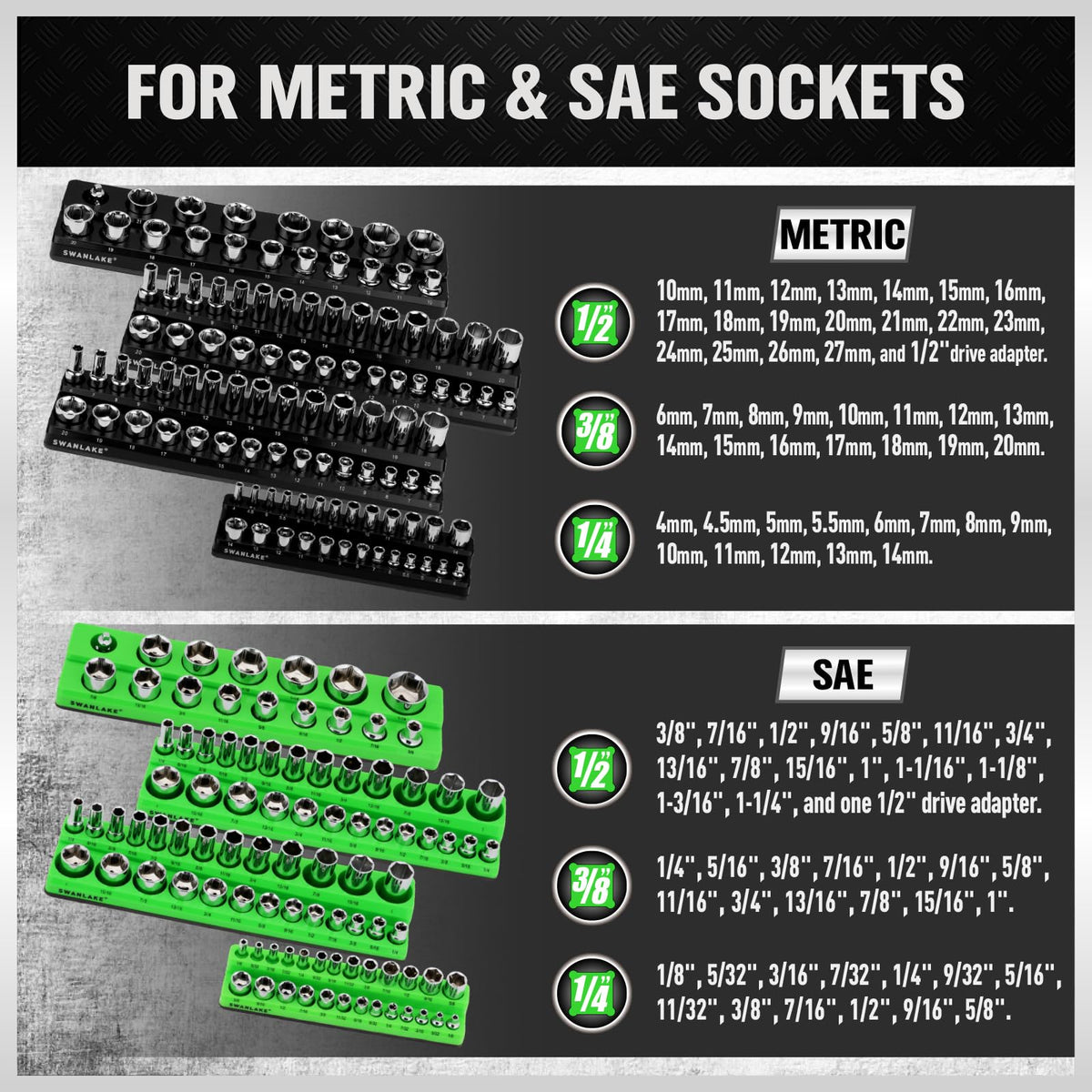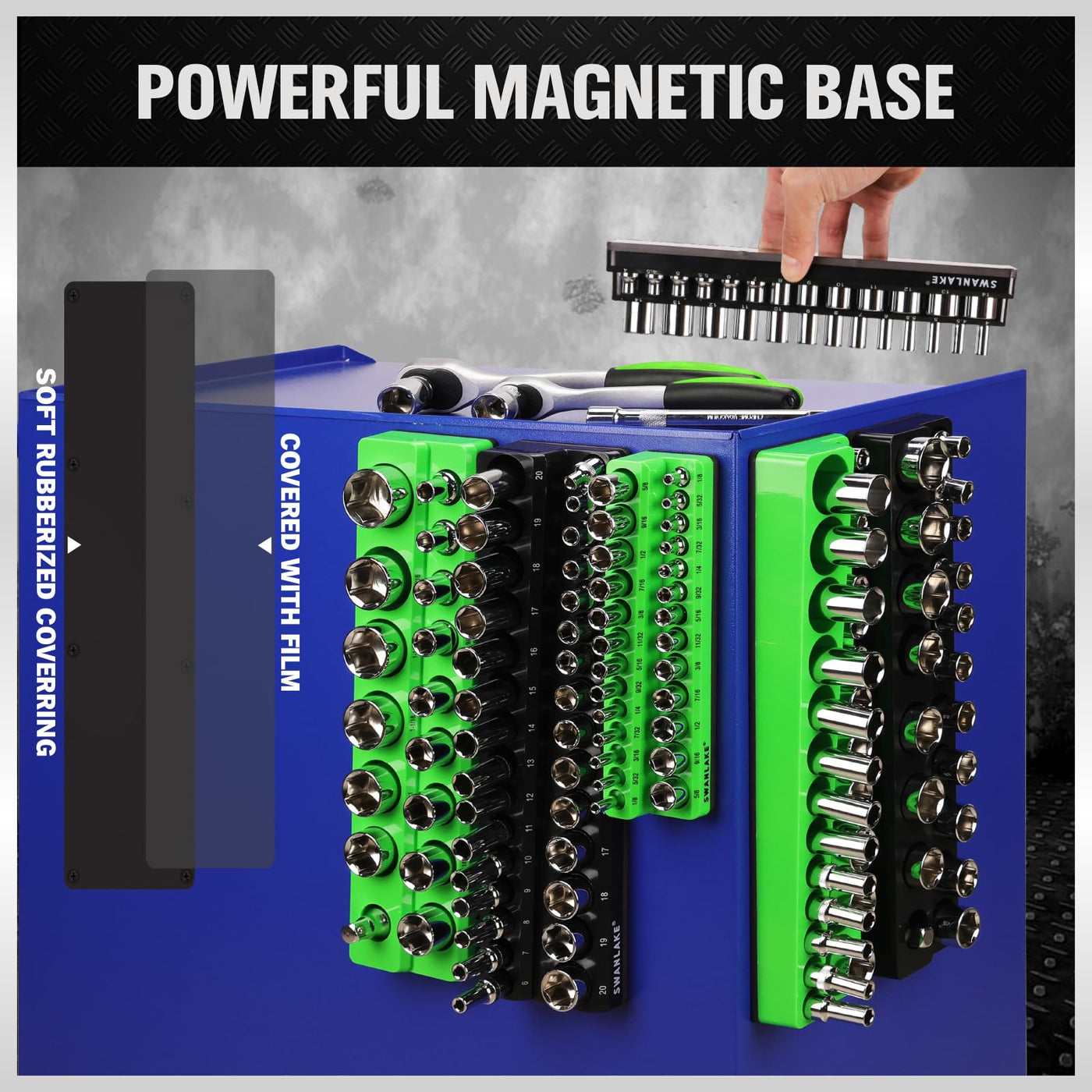 Maximize Your Tool Organization With Our Magnetic Socket Organizer Holder Tool. This 8Pcs Set Includes 2Pcs 1/4'', 4Pcs 3/8'', And 2Pcs 1/2'' Drive Socket Storage Trays, Featuring 199 Slots For Comprehensive Storage. The Soft Rubberized Covering In Black And Green Ensures Durability And Protection For Your Sockets (Sockets Not Included). Perfect For Any Garage Or Workshop, This Is The Ultimate Solution For Keeping Your Tools Easily Accessible And Neatly Arranged.