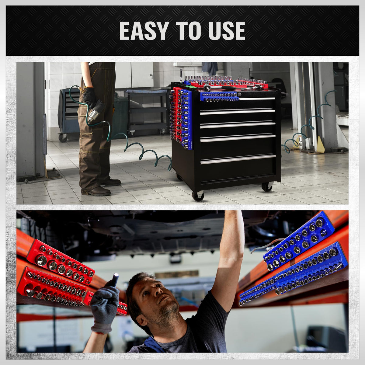 Q: Are the organizers suitable for both metric and SAE sockets?A: Yes, the set includes both blue metric magnetic socket organizers and red SAE magnetic socket organizers, making it versatile for a variety of socket types.