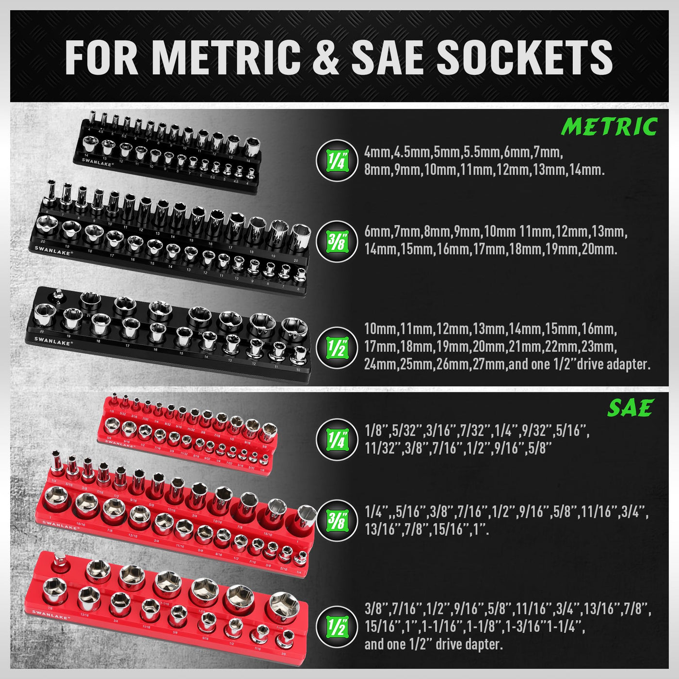 Q: What types of sockets does the Magnetic Socket Organizer Set accommodate?A: The 6-piece Magnetic Socket Organizer Set is designed to hold both Metric and SAE drive sockets, fitting a total of 143 shallow and deep sockets in sizes of 1/4", 3/8", and 1/2".