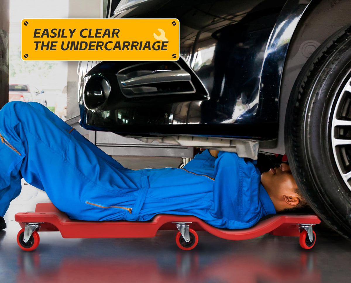 Easily clear the undercarriage of most vehicles with our MaxWorks oversized low-profile automotive creeper. The automotive creeper has a high-impact PVC body that won't rust and is easy to clean. With a padded headrest and capacity up to 300 lb.