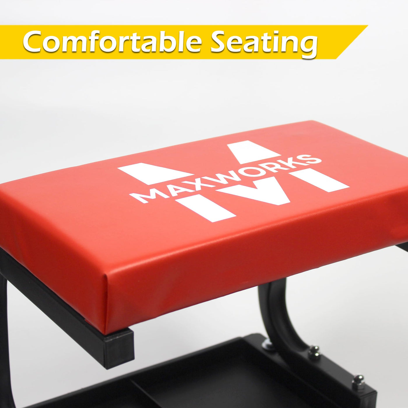MaxWorks foam cushioned rolling shop seat provides comfort and easy access to tools with its integrated high-impact PVC pan. Featuring a durable steel frame, 2 in. swivel casters made of high-impact poly and a weight capacity of 250 lbs., this mechanics shop seat is the ideal combination of sturdy and comfortable for long jobs under the car.