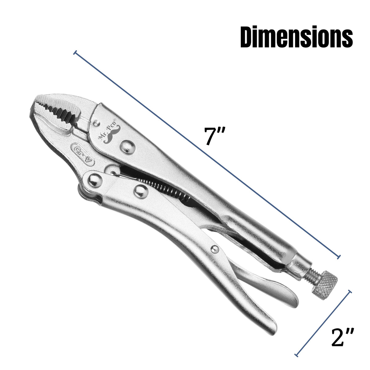 Q: What are the dimensions of the Mr. Pen locking pliers?A: The Mr. Pen locking pliers measure 7 inches in length and 2 inches in width, with a mouth opening capacity of up to 2.1 inches, making them versatile for various applications.