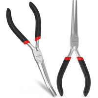 Pack Includes: 2 x Bent & Long Needle Nose Pliers for Jewelry Making Jaw Length: 2 inches Total Length: 6 Inches Jaw Type: Flat Material: Carbon Steel & High-Grade PVC