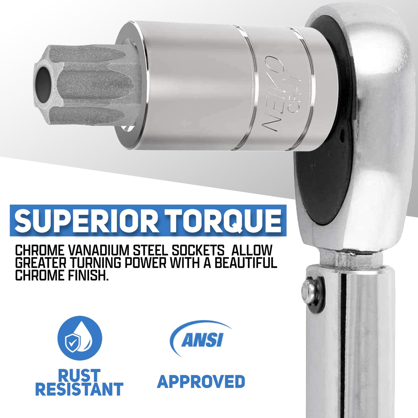 Q: Is the Neiko Torx set suitable for professional use?A: Yes, the Neiko 10070A Torx set is designed for both DIY enthusiasts and professionals, offering high-quality, tamper-resistant sockets that provide added torque for loosening hard-to-access fasteners.