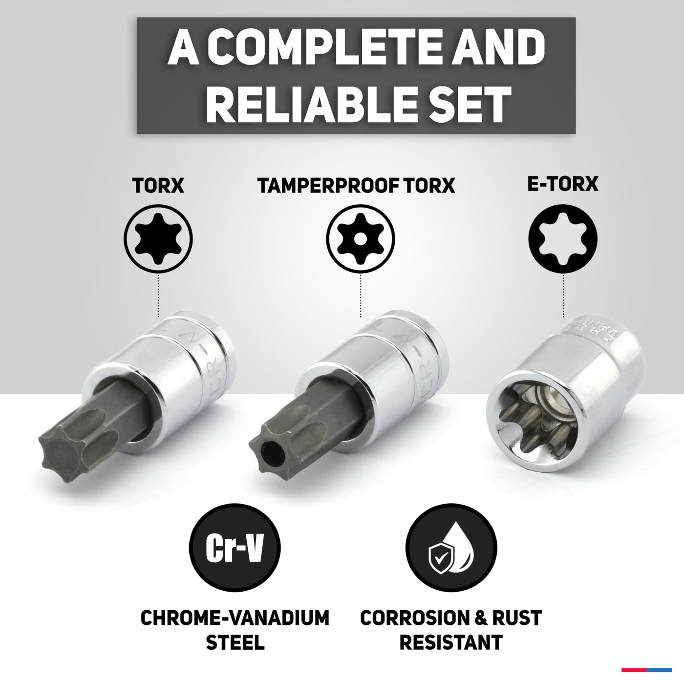 Premium S2 steel bits provide optimal strength and durability to unfasten intractable screws and bit ends are sized for precise fitting. Sockets are made of enduring Chrome-Vanadium.Set Includes:10-piece Torx E socket:5-pc. 1/4 in. drive: E4, E5, E6, E7, E84-pc. 3/8 in. drive: E10, E12, E14, E161-pc. 1/2 in. drive: E1813-piece Torx Bit Socket:7-pc. 1/4 in. drive: T8, T10, T15, T20, T25, T27, T305-pc. 3/8 in. drive: T40, T45, T47, T50, T551-pc. 1/2 in. drive: T6012-piece Torx Tamper Bit Socket:8-pc. 1/4 in. drive: TT8H, TT9, TT10, TT15, TT20, TT25, TT27, TT304-pc. 3/8 in. drive: TT40, TT45, TT50, TT55Storage and carrying case included.