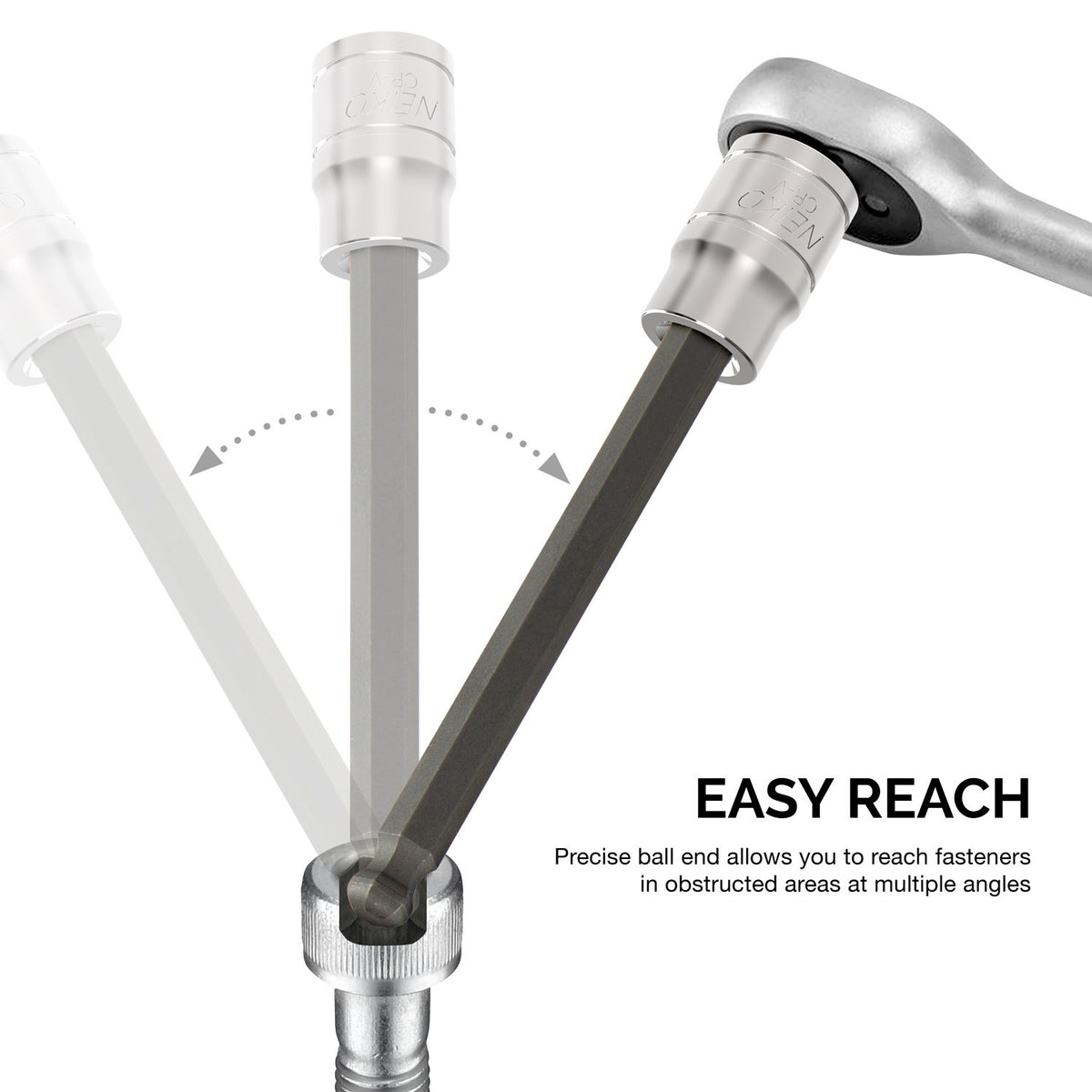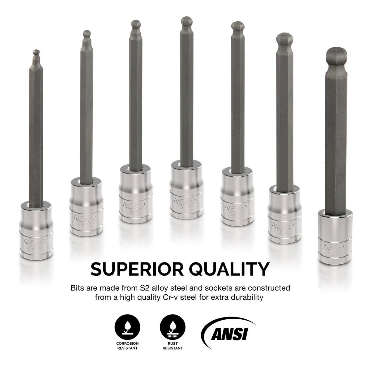 Bits made from premium S2 alloy steel for superior hardness that reduces wear-out and insures longevity High strength chrome vanadium sockets provide superior torque for greater turning power and mirror chrome finish for corrosion resistance 4-1/4 Inch (110mm) extra long shaft extends reach to fasteners in deep and tight spots Precisely machined ball end ensures accurate tip size and allows access to fasteners from multiple angles to get around obstructions Set includes a heavy duty storage case and 7 pcs 3/8 in. drive metric hex bit sockets: 3, 4, 5, 6, 7, 8, 10mm