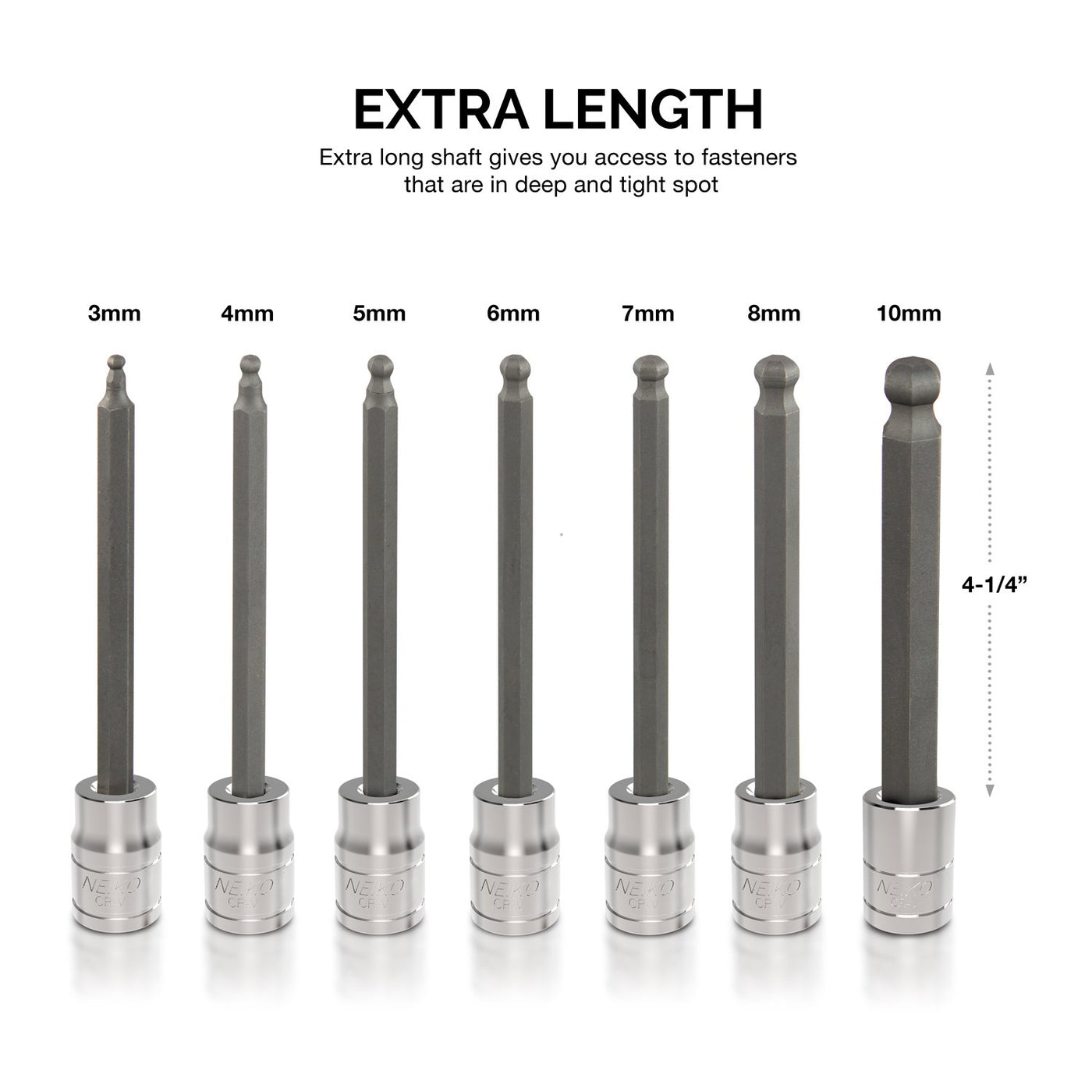 Q: How long are the extra-long ball-end hex bits?A: The extra-long ball-end hex bits feature a 4-1/4 inch (110mm) shaft, allowing you to reach fasteners in deep and tight spots with ease.