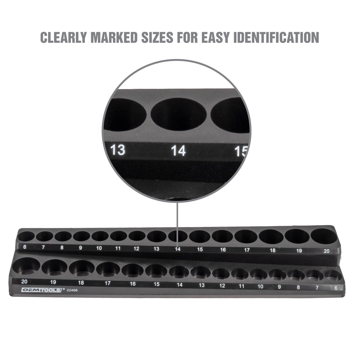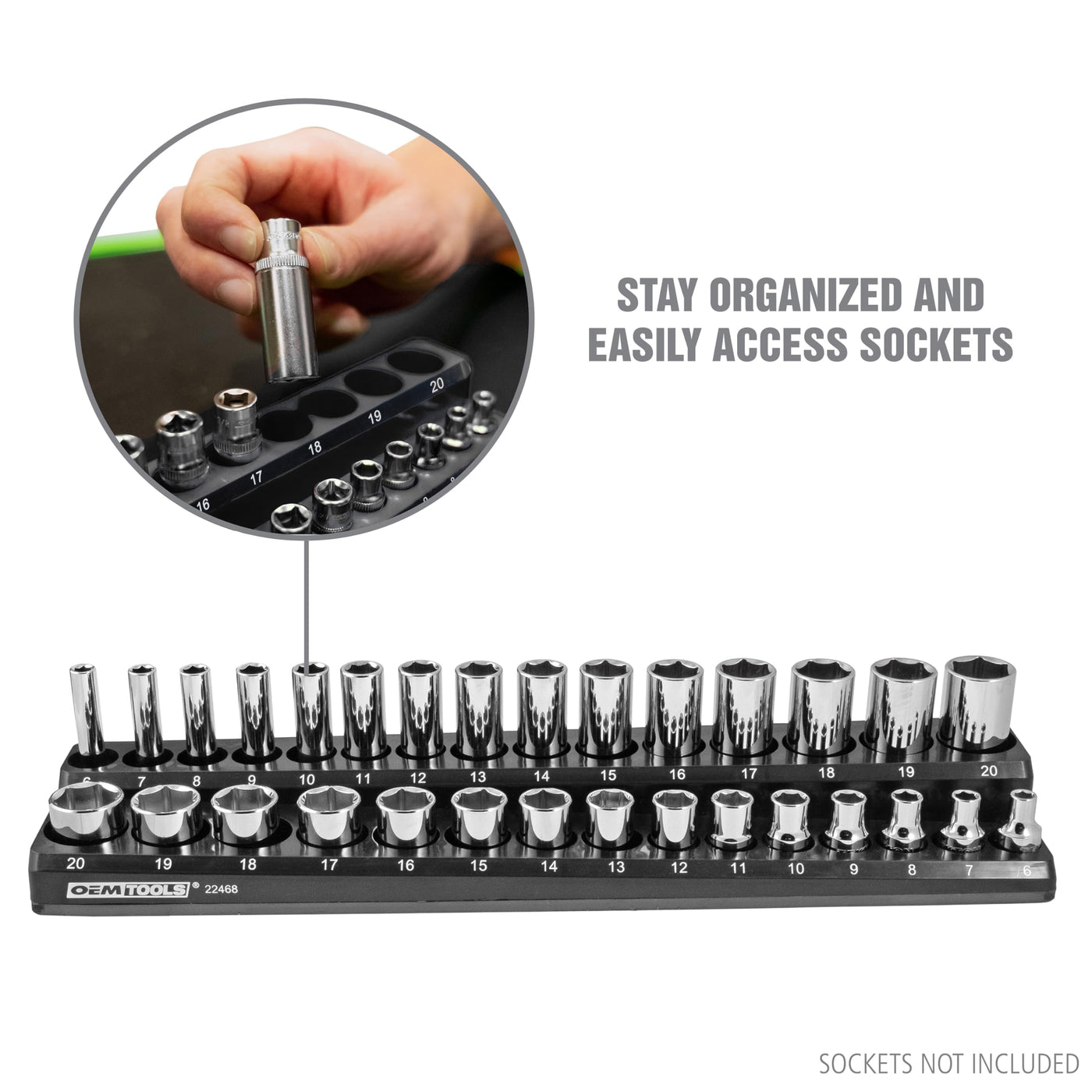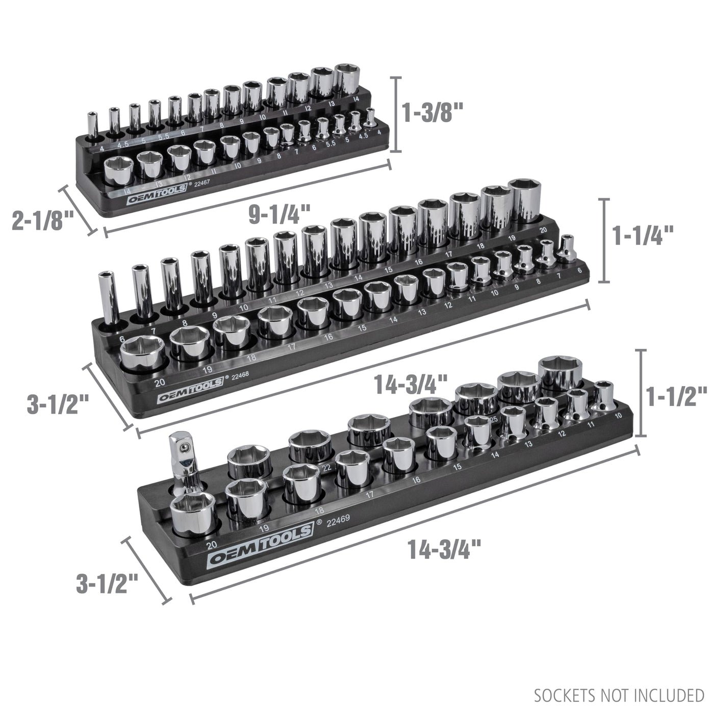 Finding The Right Socket In A Pile Or A Tool Box Drawer Wastes Time You Could Be Spending On Automotive Or Household Projects. Wouldnt It Be Nice To Have Socket Storage For Tool Chest Drawers And Tool Boxes That Are Easily Carried And Conveniently Magnetic? Oemtools 22487 3 Piece Metric Magnetic Socket Organizers Have You Covered. This Set Is The Best Metric Socket Organizer On The Market. Take This Socket Organizer For Toolboxes Anywhere. Easily Carried, You Can Stick Our Strong Magnetic Socket Tray On Any Ferrous Surface. Lifts, Rolling Carts, Tool Chests, And More Become Convenient Storage Spaces To Attach Your Magnetic Socket Tray Organizer. These Magnetic Tool Box Accessories Make Your Sockets More Accessible For Automotive, Electrical, And Home Maintenance. Our Socket Trays For Tool Boxes Can Even Be Set Upside Down Without Losing Sockets. Dont Waste Time Looking For The Right Size Socket With Our Socket Holders Organizers For Tool Box'S Easy-To-Identify Sizing System. Our 3-Piece Metric Socket Holder Magnetic Set Comes With 75 Slots-A 3/8 Socket Holder, 1/2 Socket Organizer, And 1/4 Socket Organizer. Each Mobile Socket Organizer Is A Shallow And Deep Socket Holder That Easily Accommodates To Most Tool Chest Drawers. Changing Out Sockets For Your Pneumatic Ratchets And Power Tools Is Quick And Easy With The Identifiable Numbers On The Socket Holders Tray. No Need To Worry About Your 3/8 Socket Organizer Damaging Your Ferrous Metallic Surfaces With The Oem Tools Socket Organizer'S Rubberized Backing. The Rubberized Backing On Our Magnet Socket Organizer Keeps Your Surfaces Safe From Scratches. These Socket Holders For Tool Box Dont Hold Impact Sockets. Our Metric Magnetic Socket Organizers For Toolboxes Come In A Variety Of Colors, Provided To Differentiate Metric Socket Storage From Socket Organizers Metric. Organize Your Home, Shop, Or Garage Efficiently With Oemtools 22487 3 Piece Metric Magnetic Socket Organizers.