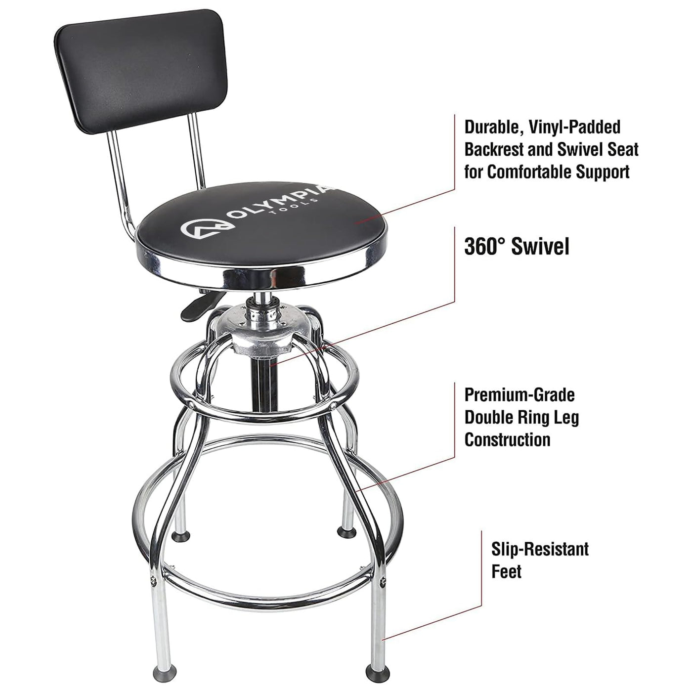 The tough vinyl padding is Stain- and spill-resistant so your seat wipes clean easily and is always looking great. The adjustable, high-traction feet give you a stable base, while the foot rests provide added strength and a comfy place to rest your legs. A high-polish chrome finish helps to extend the life of your seat by resisting rust and corrosion. Padded vinyl seat features a backrest for comfort stool rotates 360 for maximum flexibility sturdy top and bottom rings encircle the frame for durability slip resistant fee