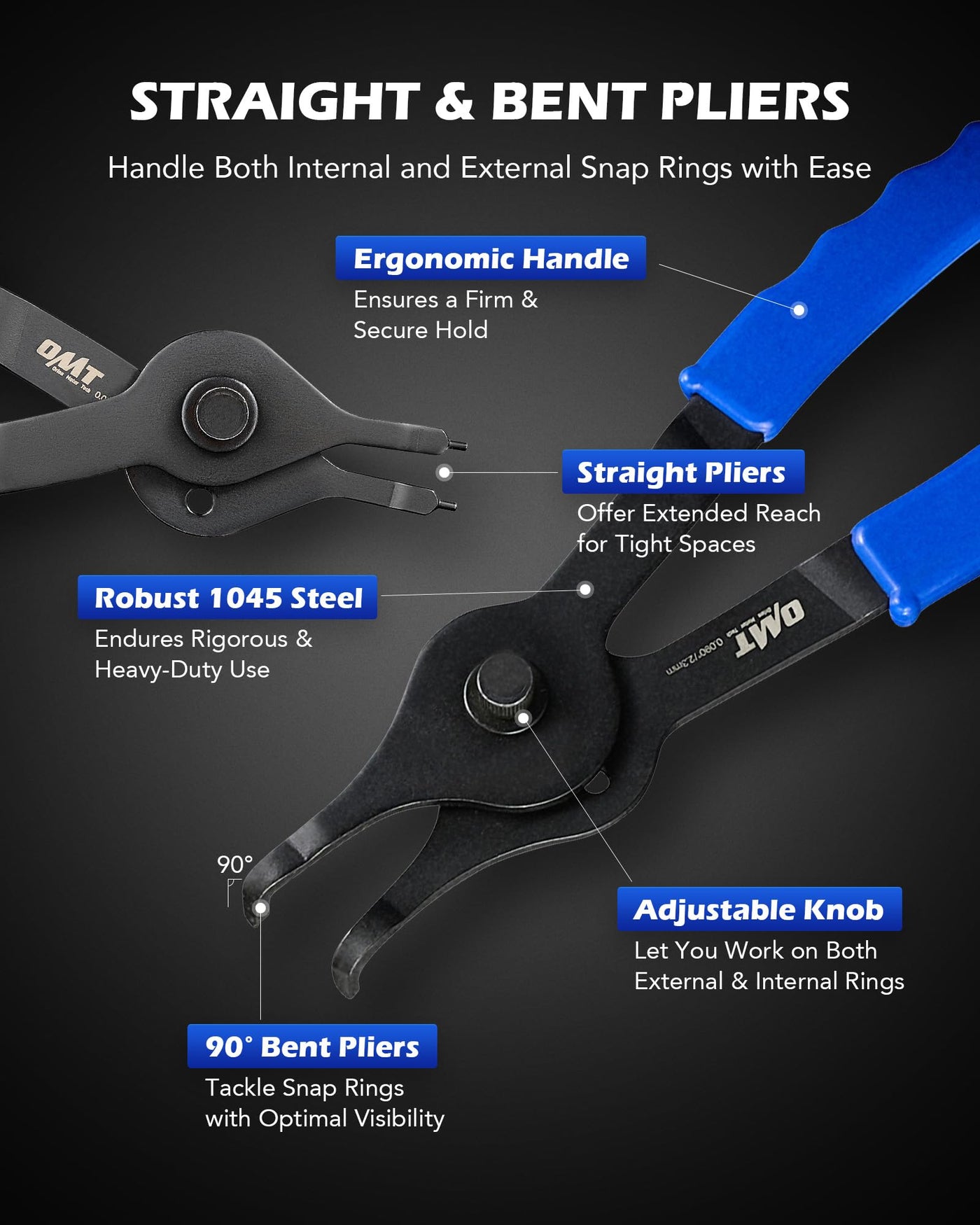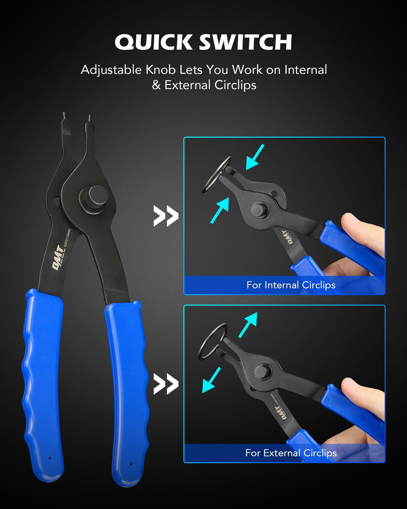 Q: Are the snap ring pliers suitable for both internal and external rings?A: Yes, the pliers in this set feature an adjustable knob that allows for quick switching between internal and external snap rings, making them versatile for various tasks.