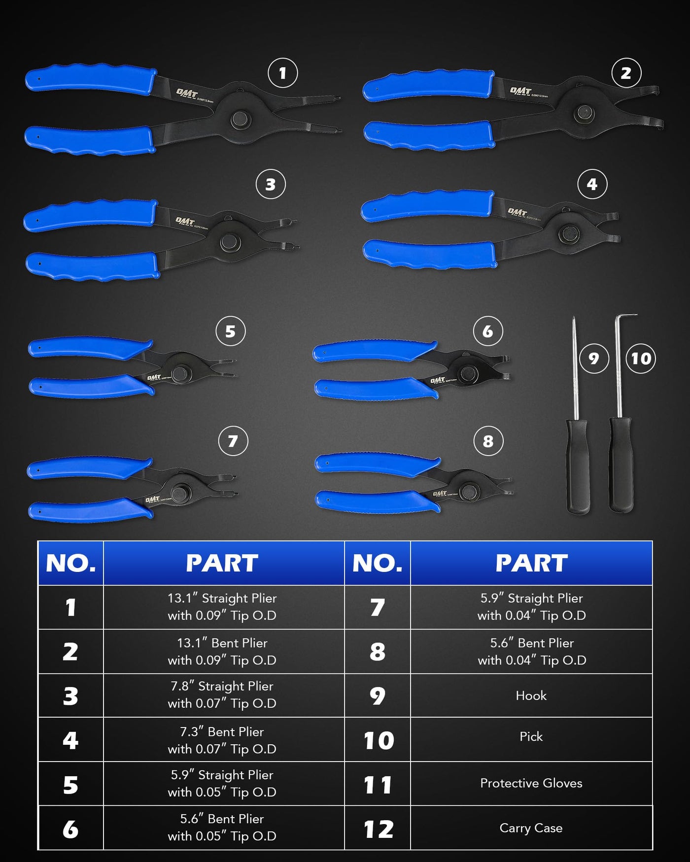 Q: What is included in the Orion Motor Tech 10pc Snap Ring Pliers Set?A: The Orion Motor Tech 10pc Snap Ring Pliers Set includes 4 straight pliers, 4 bent pliers, a pick, a hook, 2 protective gloves, and a carry case for easy storage and organization.