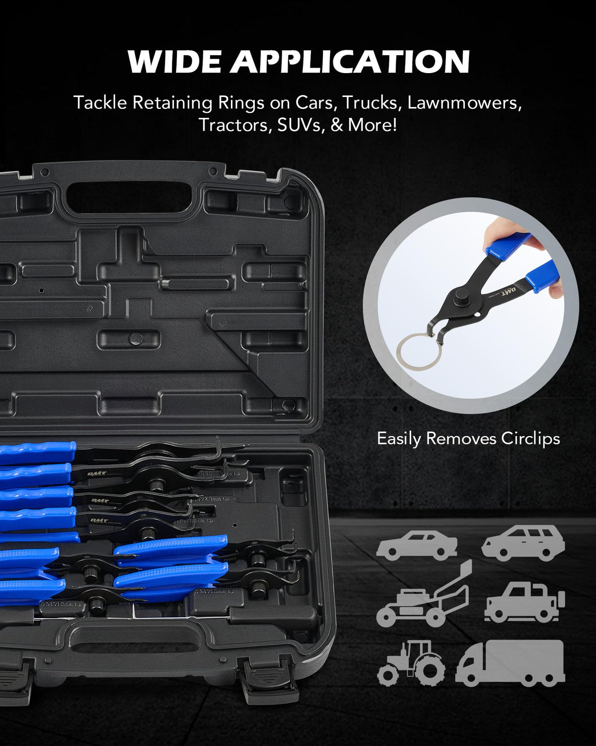 Q: Can these pliers be used for automotive applications?A: Yes, the Orion Motor Tech Snap Ring Pliers Set is ideal for removing retaining rings and circlips from vehicles, as well as from farm equipment, making it perfect for both DIY enthusiasts and professional mechanics.