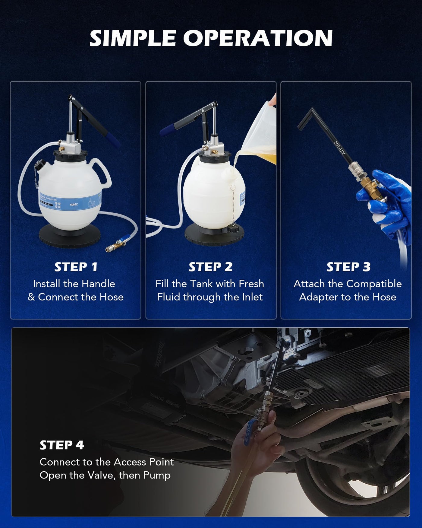 Get your oil and transmission liquid changed quickly and easily with Orion Motor Tech’s transmission fluid transfer pump! Whether you're a professional mechanic or DIY enthusiast, this 2 gallon (7.5 L) manual transmission fluid pump lets you fill your transmission fluid easily and efficiently with its comfortable long handle. Enjoy convenient connection, precise flow control, and clear observation with this user-friendly liquid dispenser tool kit. The 15 provided ATF adapters and a blow-molded case ensure great versatility and provide easy transport between jobs. Constructed from high-quality nylon, plastic, and steel, our transmission fill pump boasts superior heat and corrosion resistance for long-lasting resilience so you can service your car quicker, easier, and cheaper for many years to come!