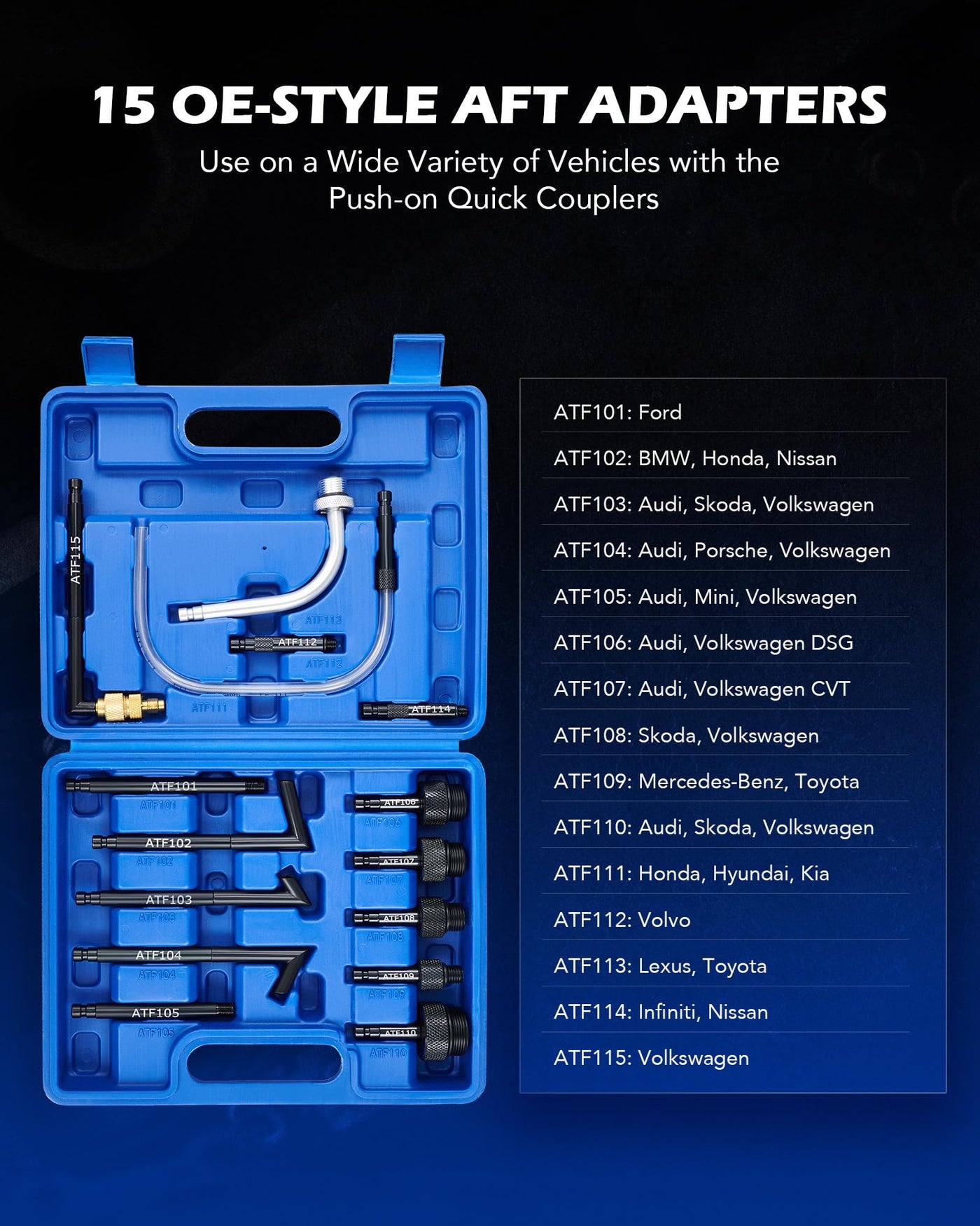Q: What types of vehicles is the Orion Motor Tech Transmission Fluid Pump compatible with?A: The Orion Motor Tech Transmission Fluid Pump is compatible with most cars, thanks to the 15 ATF refill adapters included in the kit. These adapters allow for easy connection to various master cylinders, making it a versatile tool for both professional mechanics and DIY enthusiasts.