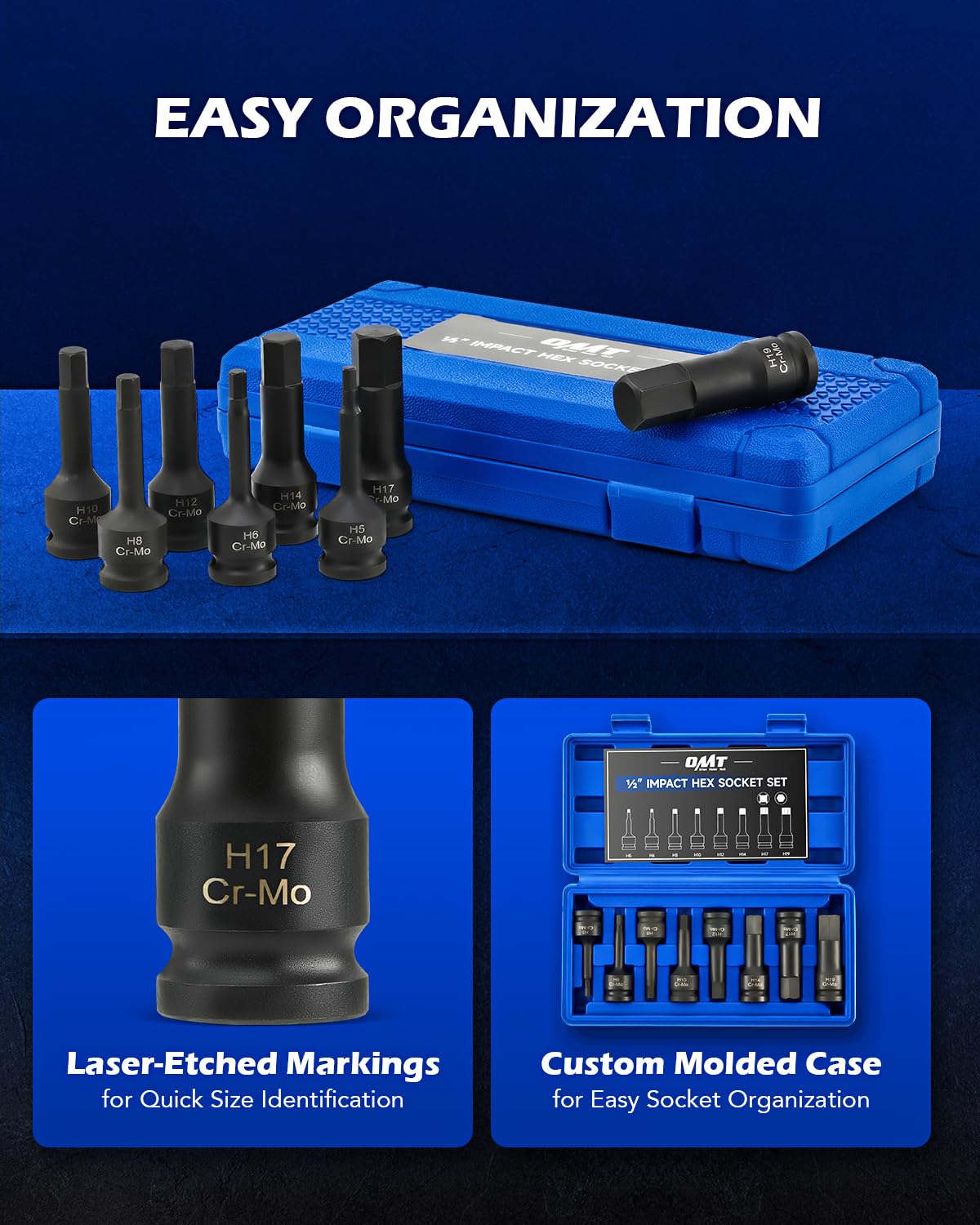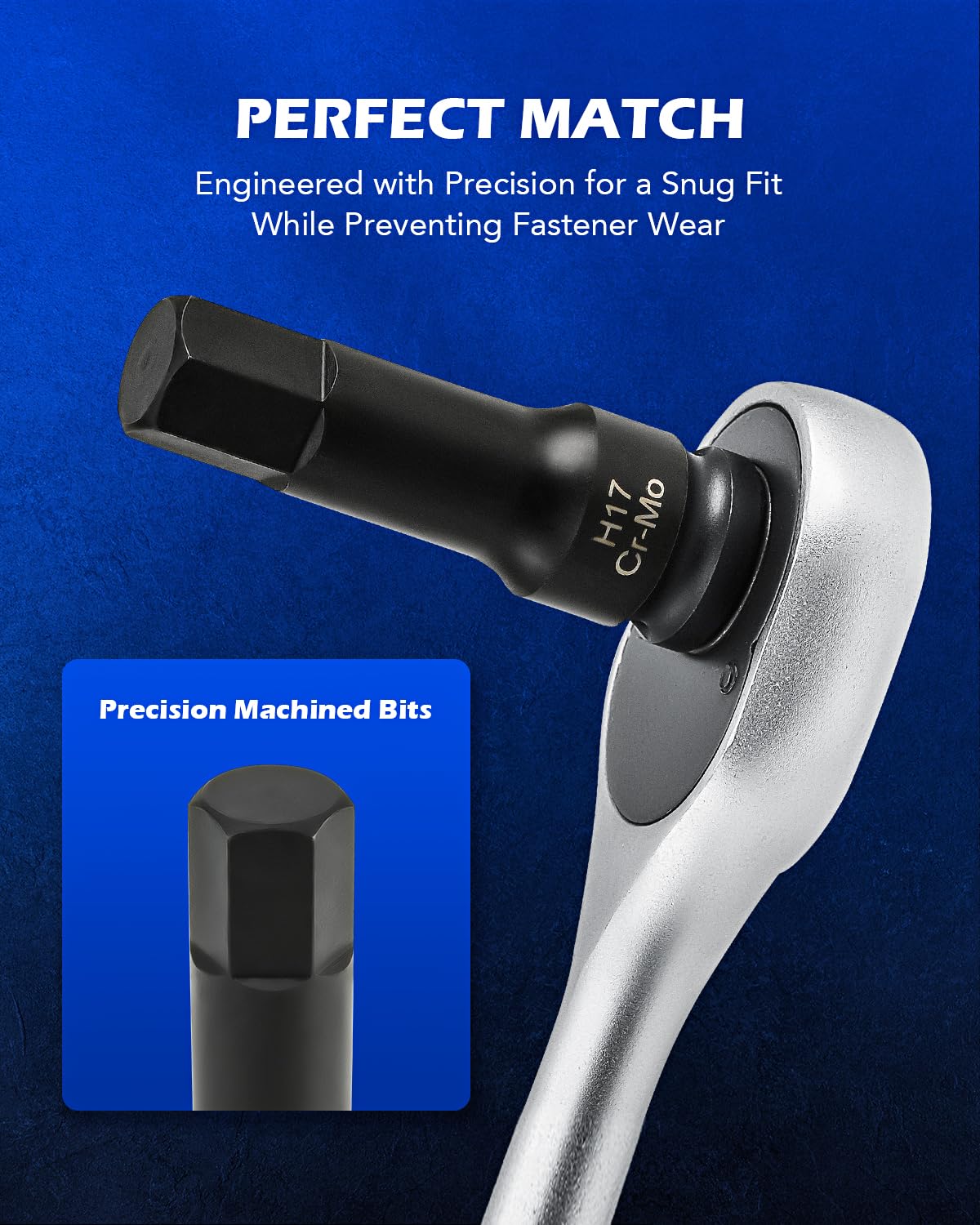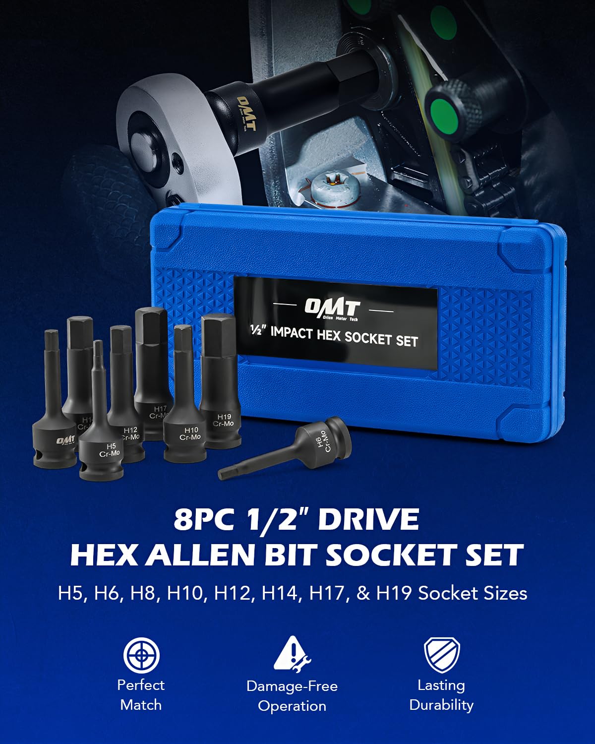 Orion Motor Tech Hex Allen Bit Sockets, 8pc 1/2' Drive Impact Allen Bit Socket Set with H5 H6 H8 H10 H12 H14 H17 & H19 Sockets, Cr-Mo Steel Impact Metric Allen Socket Set for Socket Head Cap Bolt
