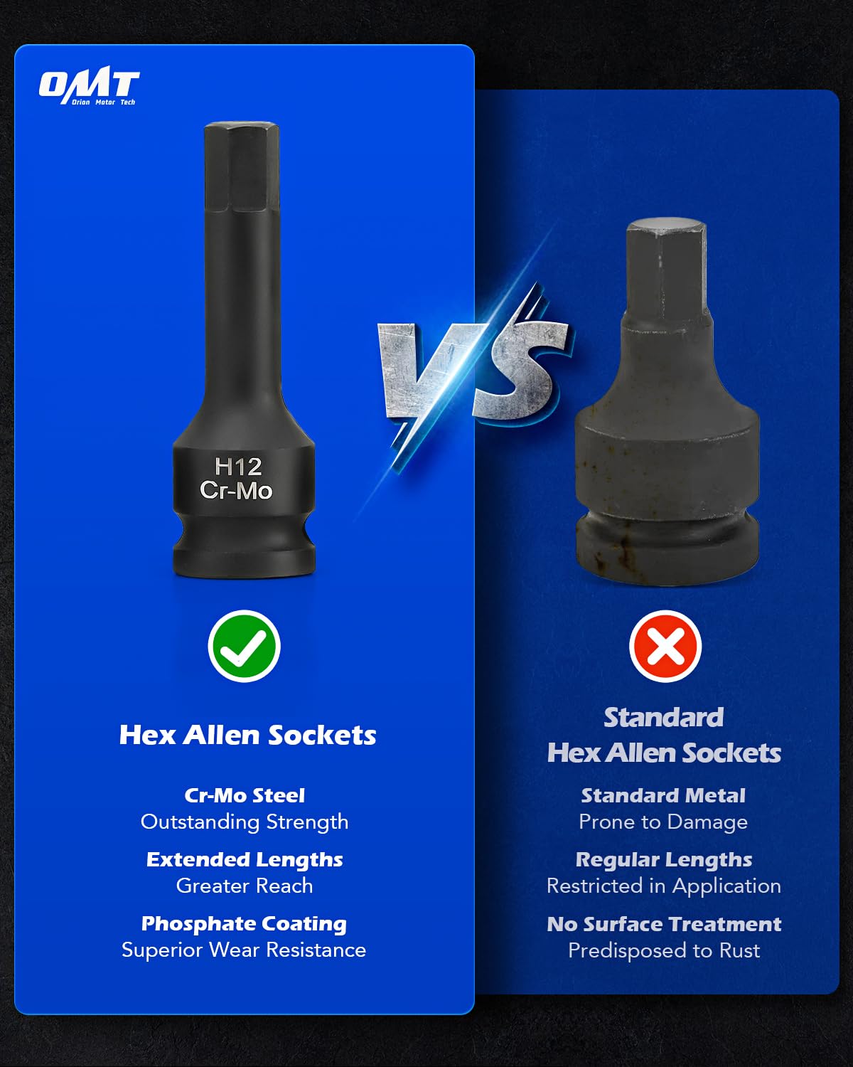 Q: What material are the Orion Motor Tech hex bit sockets made from?A: The hex bit sockets are constructed from robust Chrome Molybdenum Steel (Cr-Mo) with a black phosphate coating, ensuring superior strength and exceptional corrosion resistance.