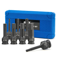 Description In search of an all in one solution for streamlining socket head cap bolt replacement? Orion Motor Tech's 1/2' drive hex bit socket set provides the answer. This set includes eight commonly used sockets: T30, T40, T45, T50, T55, T60, T70, and T80. Engineered with accessibility in mind, our impact Allen bit socket set features an extended length design for easy access to components, even in tight spaces. The precision machined bits provide a secure grip and prevent wear, ensuring even torque distribution during bolt replacement. Constructed from robust Cr-Mo steel with a black phosphate coating, our impact Allen wrench sockets are built to endure challenging conditions and boost corrosion resistance. Laser etched size markings on each socket make it a breeze to identify the right tool for the job. The included blow molded case simplifies transportation and storage.