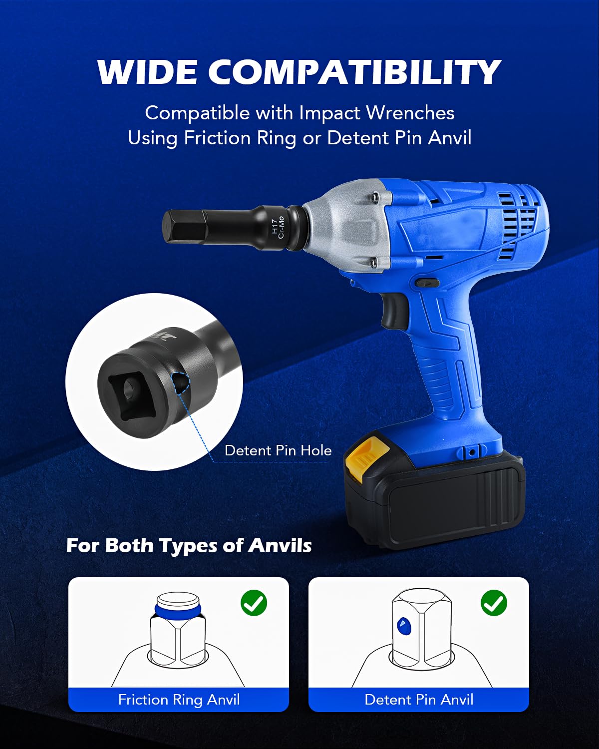 Q: Can these hex bit sockets be used with impact wrenches?A: Yes, the hex bit sockets are designed to work perfectly with impact wrenches that utilize either a friction ring or detent pin anvil, making them ideal for quick and efficient socket head cap bolt replacement.
