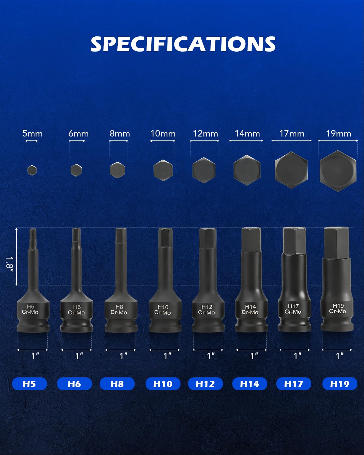 Specifications Material: Cr-Mo Steel Socket Drive: 1/2 in. Socket Sizes: H5, H6, H8, H10, H12, H14, H17, & H19 Case Dimensions: 10 x 4.7 x 2 in. (25.5x12x5 cm) Weight: 2 lb. (0.9 kg) Warranty: 1 Year