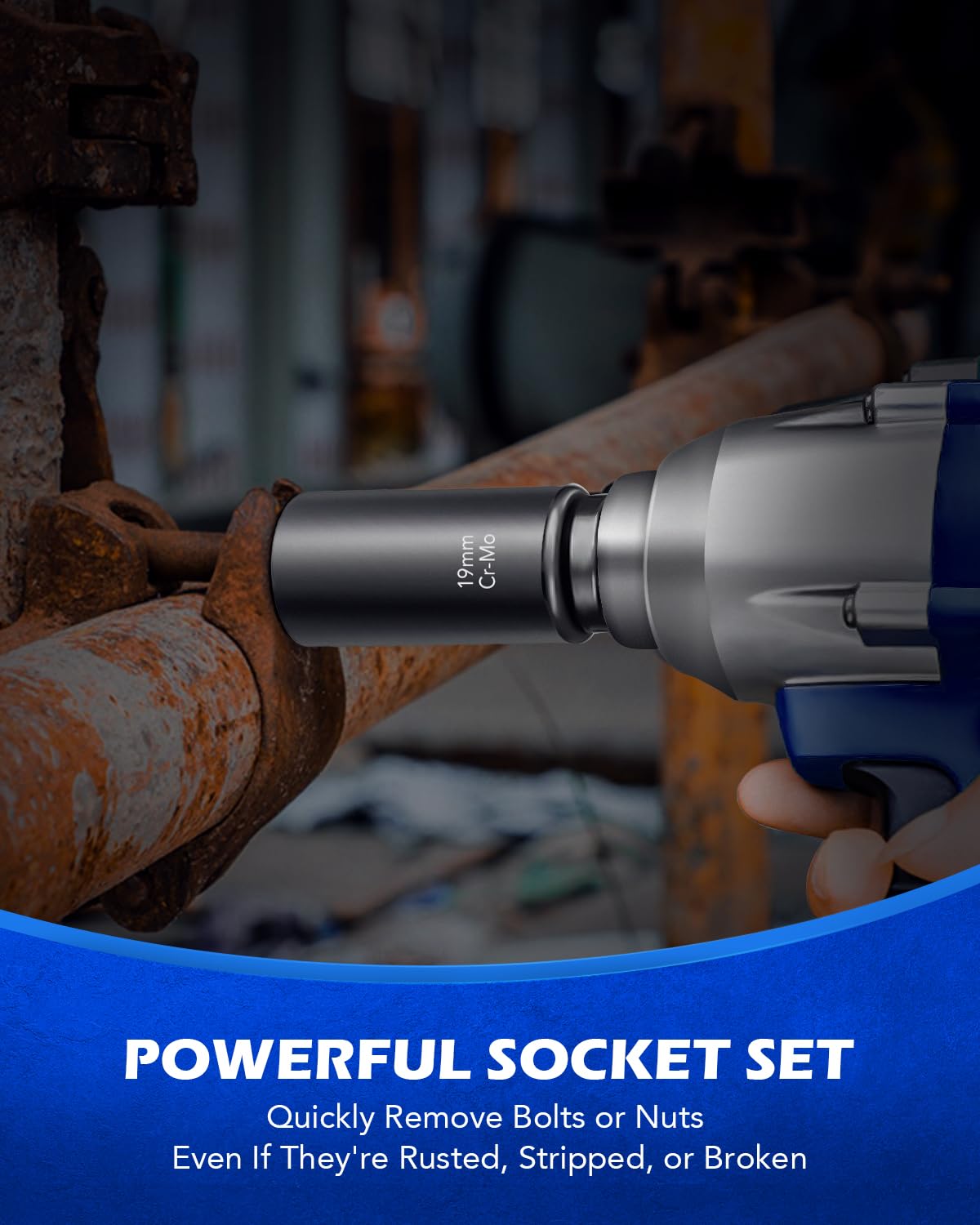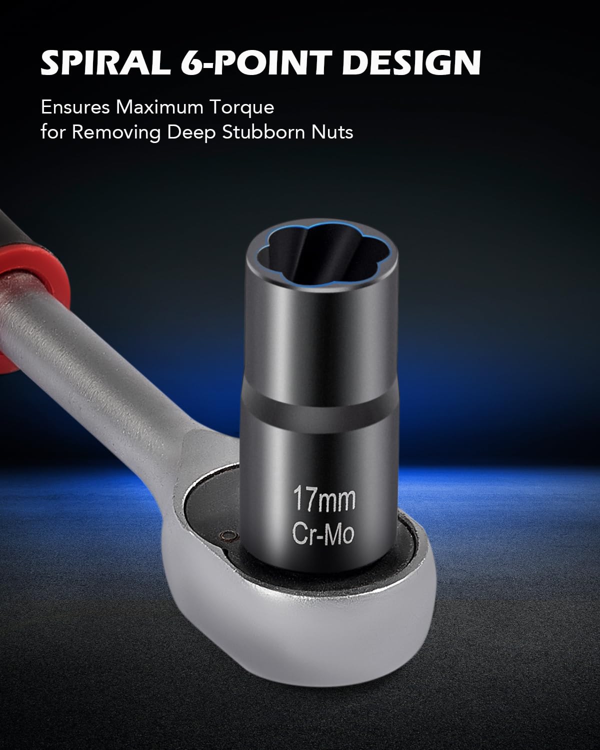 Q: How does the 6-point design of these sockets improve performance?A: The 6-point internal design of the sockets maximizes grip and torque, allowing for the easy removal of even the most stubborn fasteners, making it highly effective for rounded or stripped lug nuts and bolts.