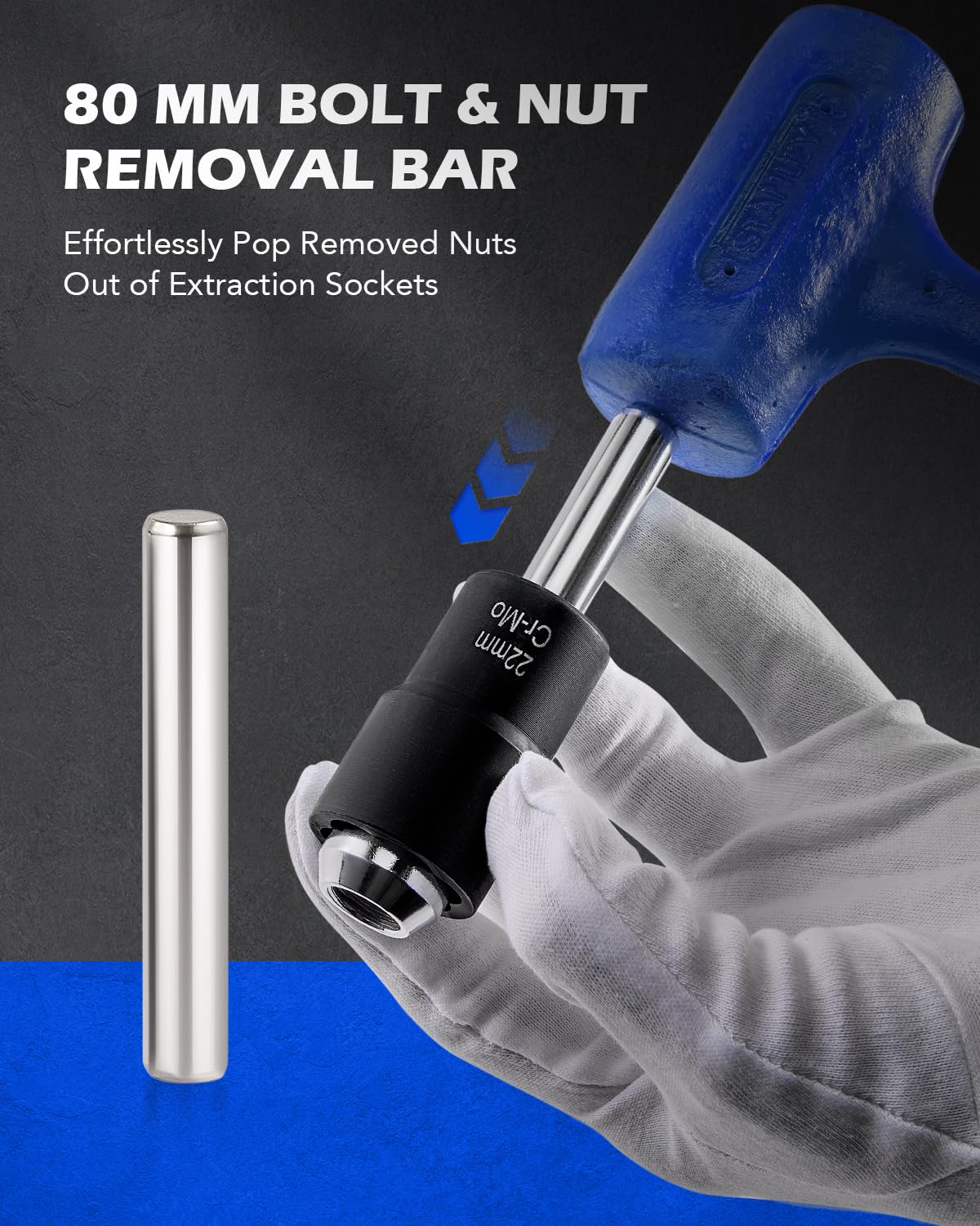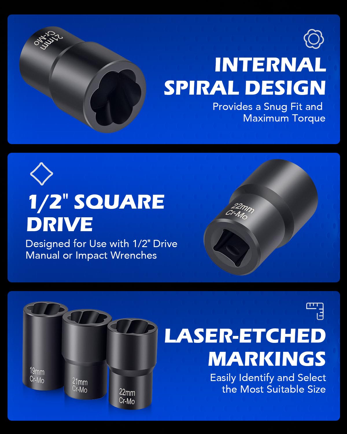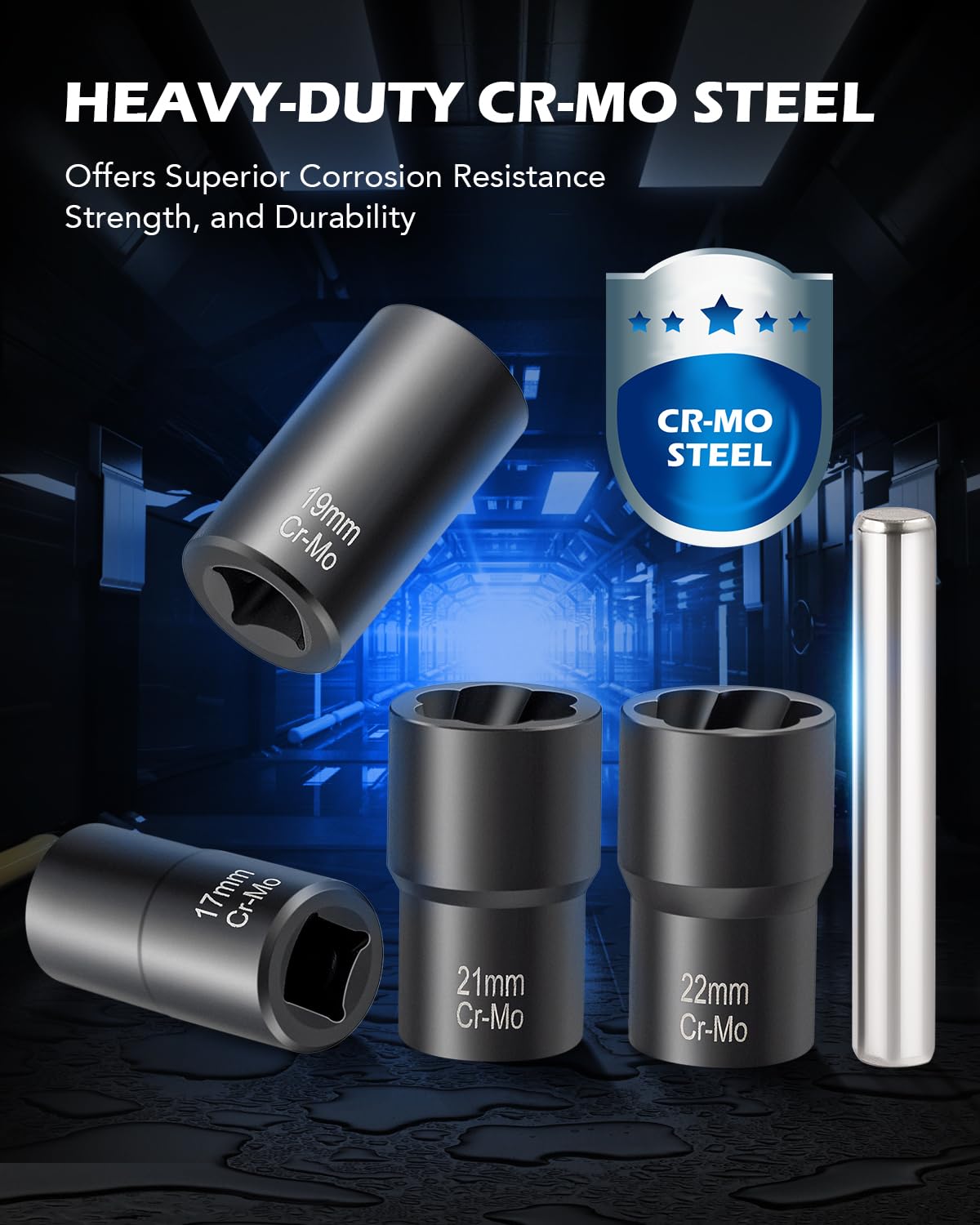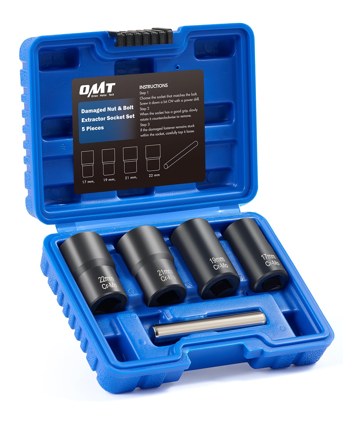 5-PIECE SET: Orion Motor Tech's socket set includes 4 twist sockets in the most commonly needed metric sizes—17mm, 19mm, 21mm, & 22mm—to quickly replace rounded or stripped lug nuts and bolts. The 12mm center punch bar pops out the removed nuts as you go | 6-POINT DESIGN: The spiraling 6-point internal design maximizes grip to give you maximal torque, easily removing even stubborn fasteners | EASY TO USE: This mechanics tool set hammers onto tricky lug nuts and bolts and then quickly loosens them with each turn of your 1/2' square drive wrench, ratchet, or breaker bar | SUPERIOR DURABILITY: All our metric sockets are constructed from high-density chrome-moly steel for strength and durability superior to the competition. The black oxide finish further improves their corrosion resistance for greater longevity | CUSTOM CASE: This bolt extractor and lug nut remover set's blow-molded case provides easy organization, storage, and transport between jobs
