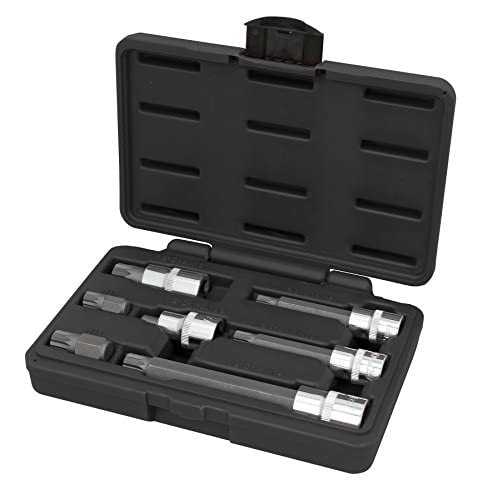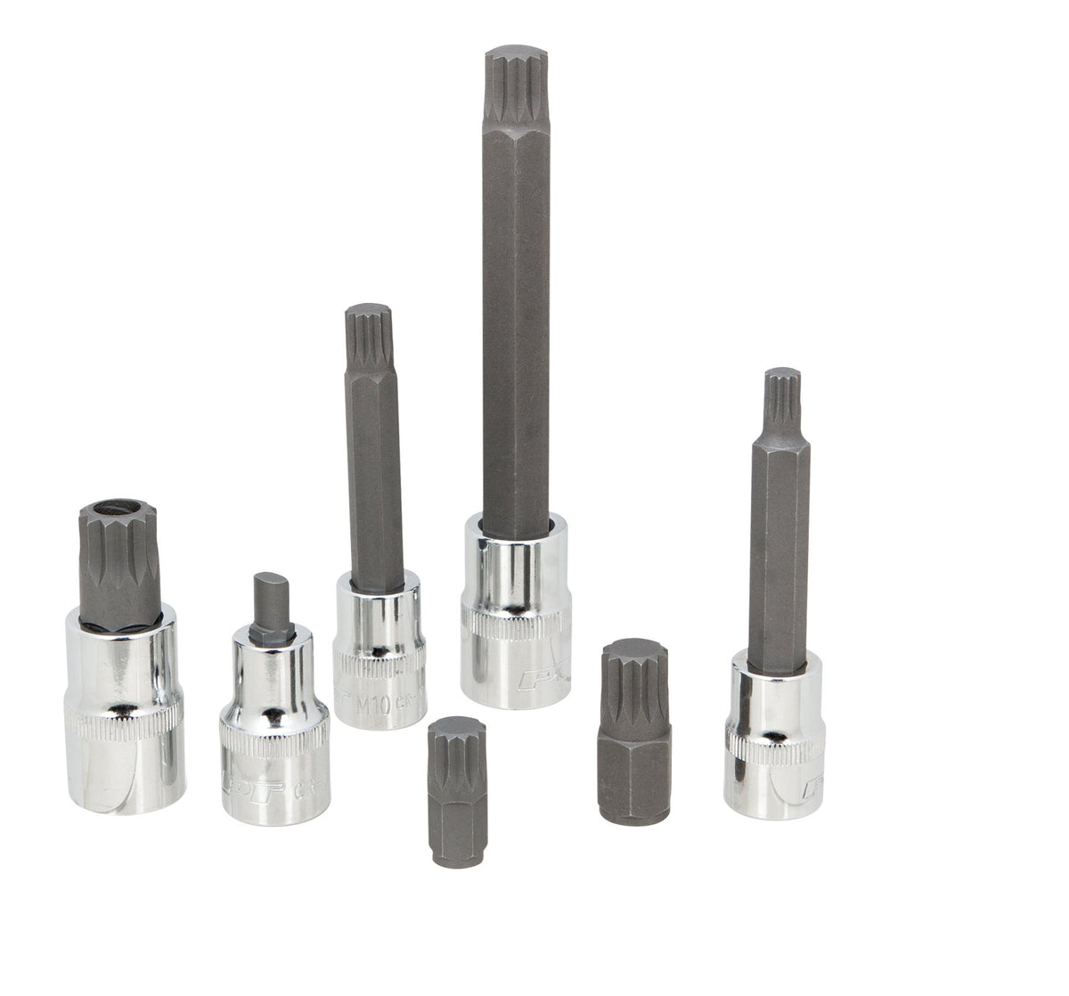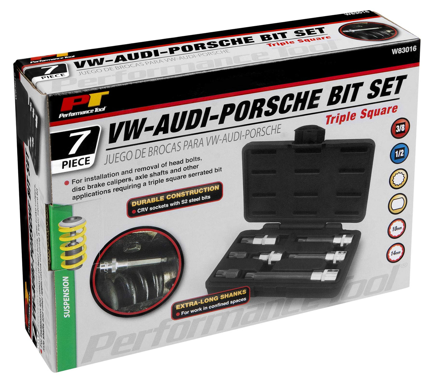 7 Piece Bit Set For VW Audi Porsche A necessary tool set when working on VW-Audi-Porsches. For working with head bolts, disc brake calipers, axle shafts and other applications. For jobs requiring a triple square serrated bit. Feature CRV sockets with S2 steel bits for durability. Blow molded storage case. Sizes include: Extra-long 8, 10 and 14mm 12 pt.; Short 12mm 12 pt.; 14mm and 16mm 12 pt. bits hex shank, and a rounded spreader bit.