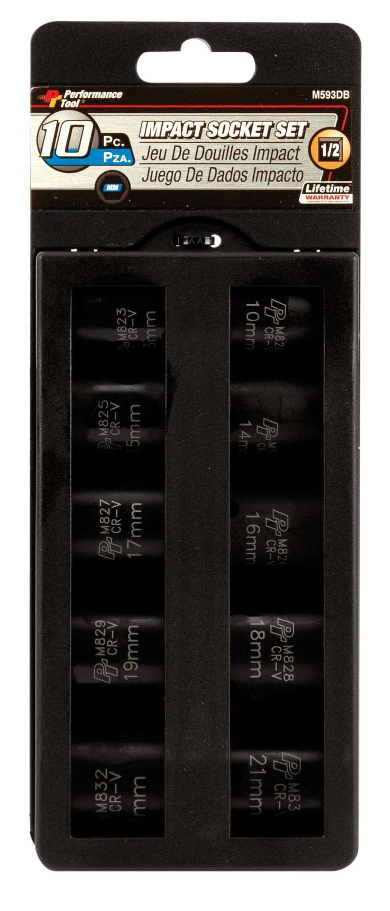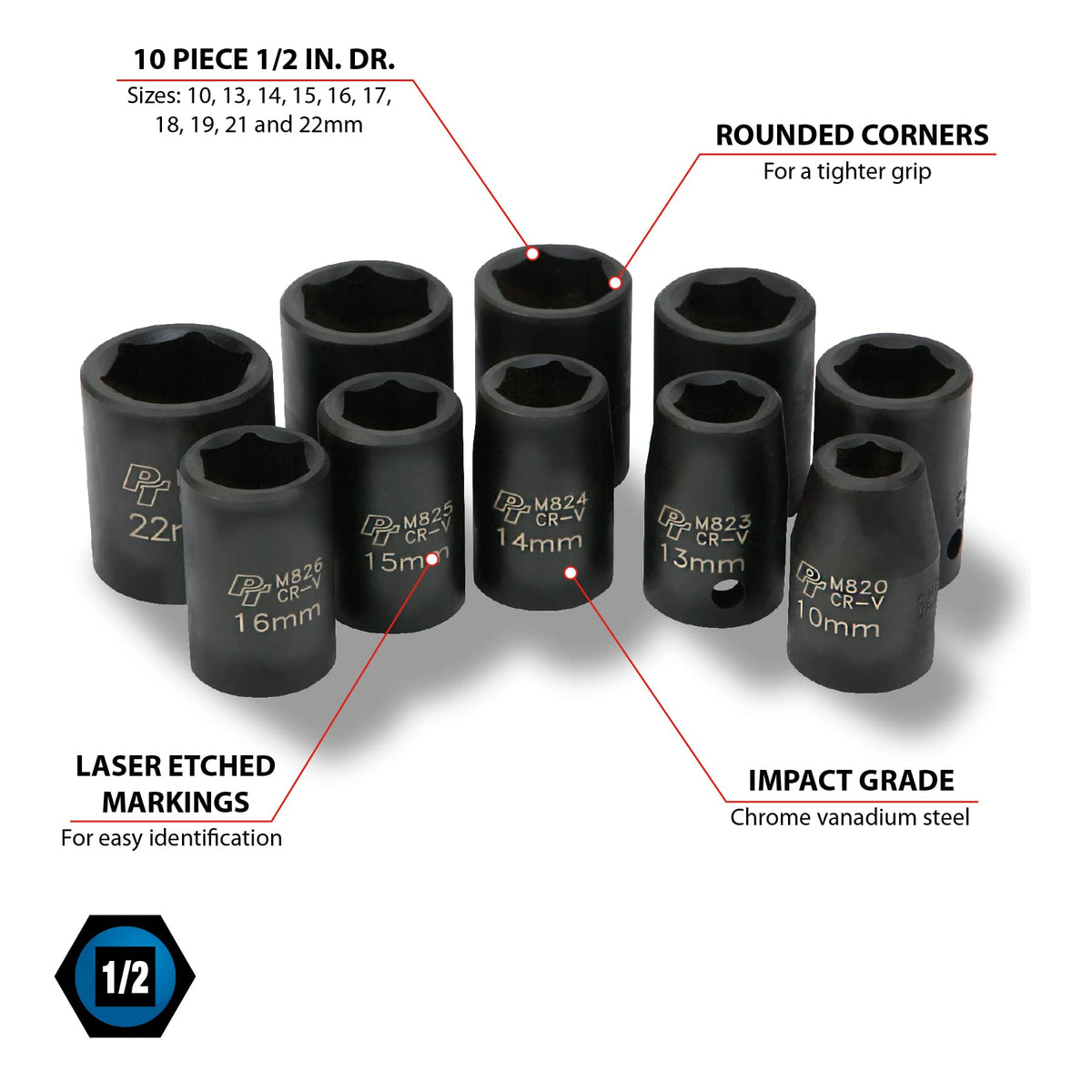Product DescriptionDrop forged chrome vanadium steel for strength and durability. Rounded corners for a tighter grip. Large size laser etching for easy identification. Sizes: 10, 13, 14, 15, 16, 17, 18, 19, 21 and 22mm.From the ManufacturerPerformance Tool Mechanics 10 Piece 1/2' Drive Metric Shallow Impact Socket Set Constructed of Tough Chrome Moly Steel that can take the punishment of daily use.
