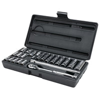 Performance Tool W36901 22 Piece 1/4 Inch Drive Socket Set Includes: 1/4 inch drive 45 gear tooth quick release ratchet, 1 universal joint, 2 inch extension, 6 inch extension, 10pc standard socket sizes: 5/32, 3/16, 7/32, 1/4, 9/32, 5/16, 11/32, 3/8, 7/16 and 1/2 inch, 8pc deep socket sizes: 7/32, 1/4, 9/32, 5/16, 11/32, 3/8, 7/16 and 1/2 inch. All pieces are made of chrome vanadium alloy steel for strength and durability, with a polished nickel chrome plated finish to resist corrosion. Sockets have recessed edges and are designed to reduce fastener rounding.