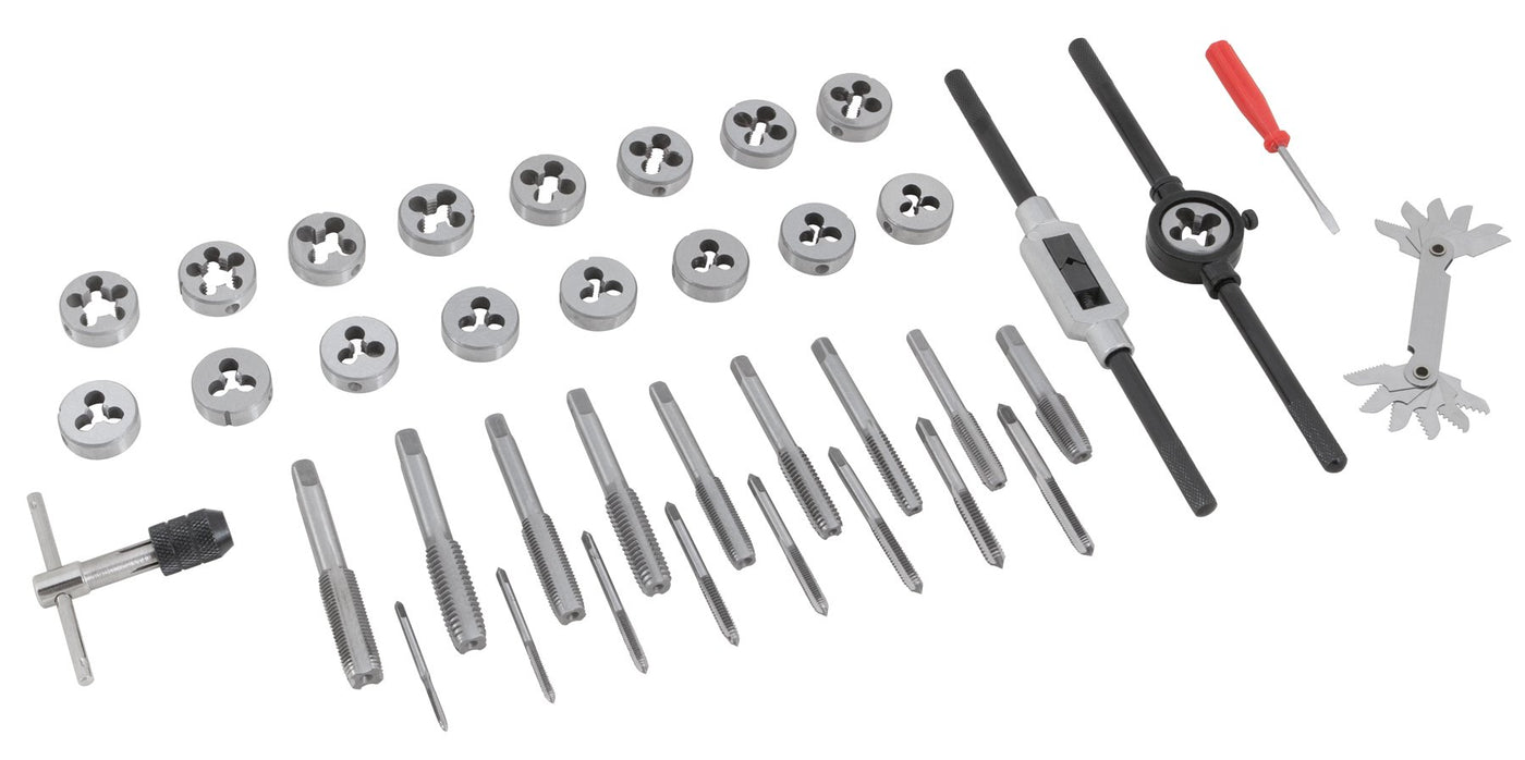 Q: What materials are used in the construction of this tap and die set?A: The taps and dies in the Performance Tool W4001DB set are made from high-quality alloy steel, ensuring durability and longevity. This material is designed to withstand the rigors of threading tasks while maintaining precision.