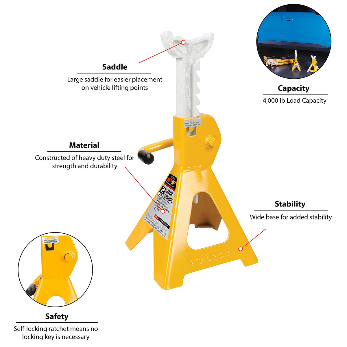 Performance Tool W41021 Ratchet Style Jack Stand Set For Lifting Vehicles During Maintenance, Yellow, 2-Ton