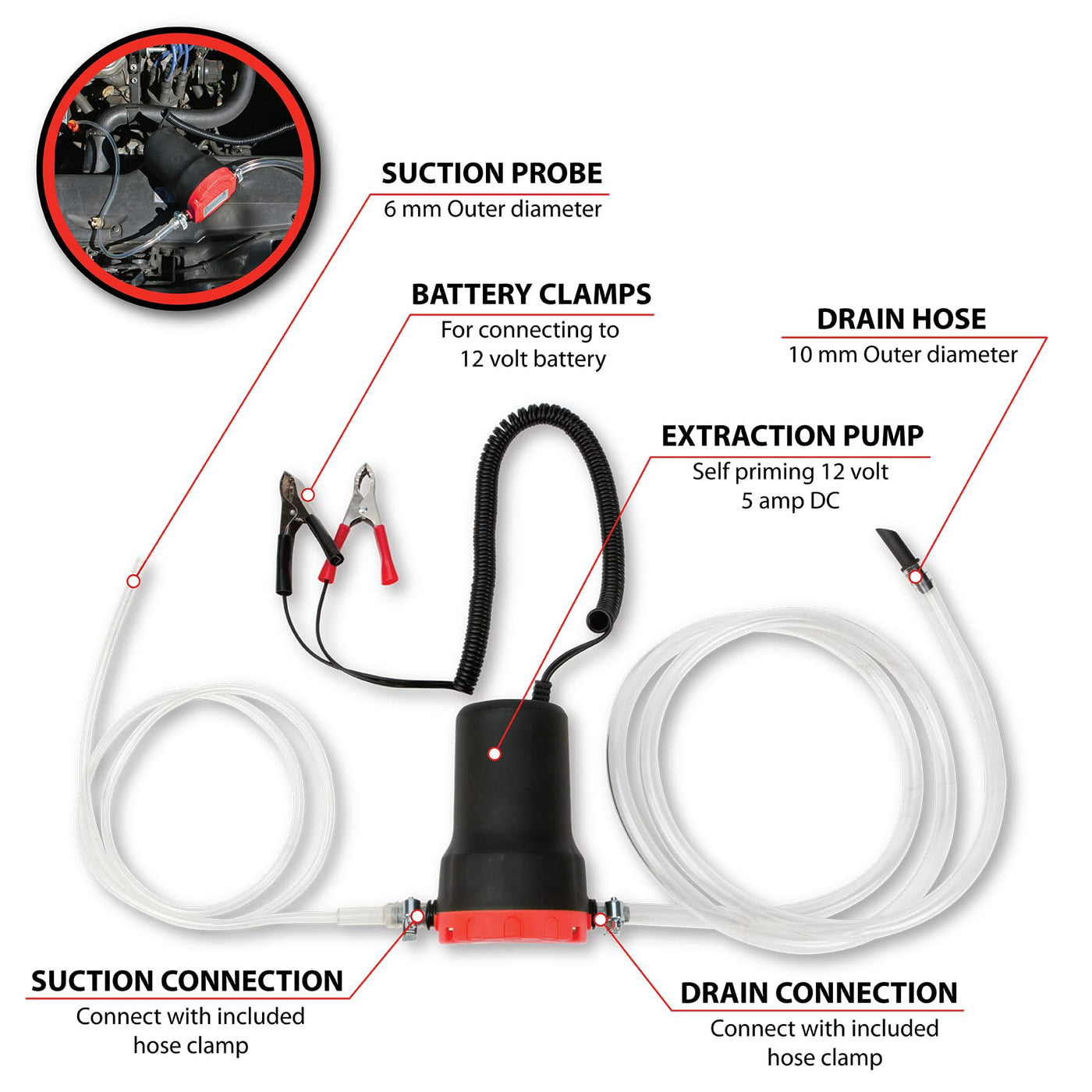 Q: What accessories are included with the oil change pump extractor?A: The complete kit includes the oil change pump, a 47-inch x 0.16-inch diameter inlet hose, a 59-inch x 0.47-inch diameter outlet hose, hose clamps, and detailed instructions for easy setup and use.