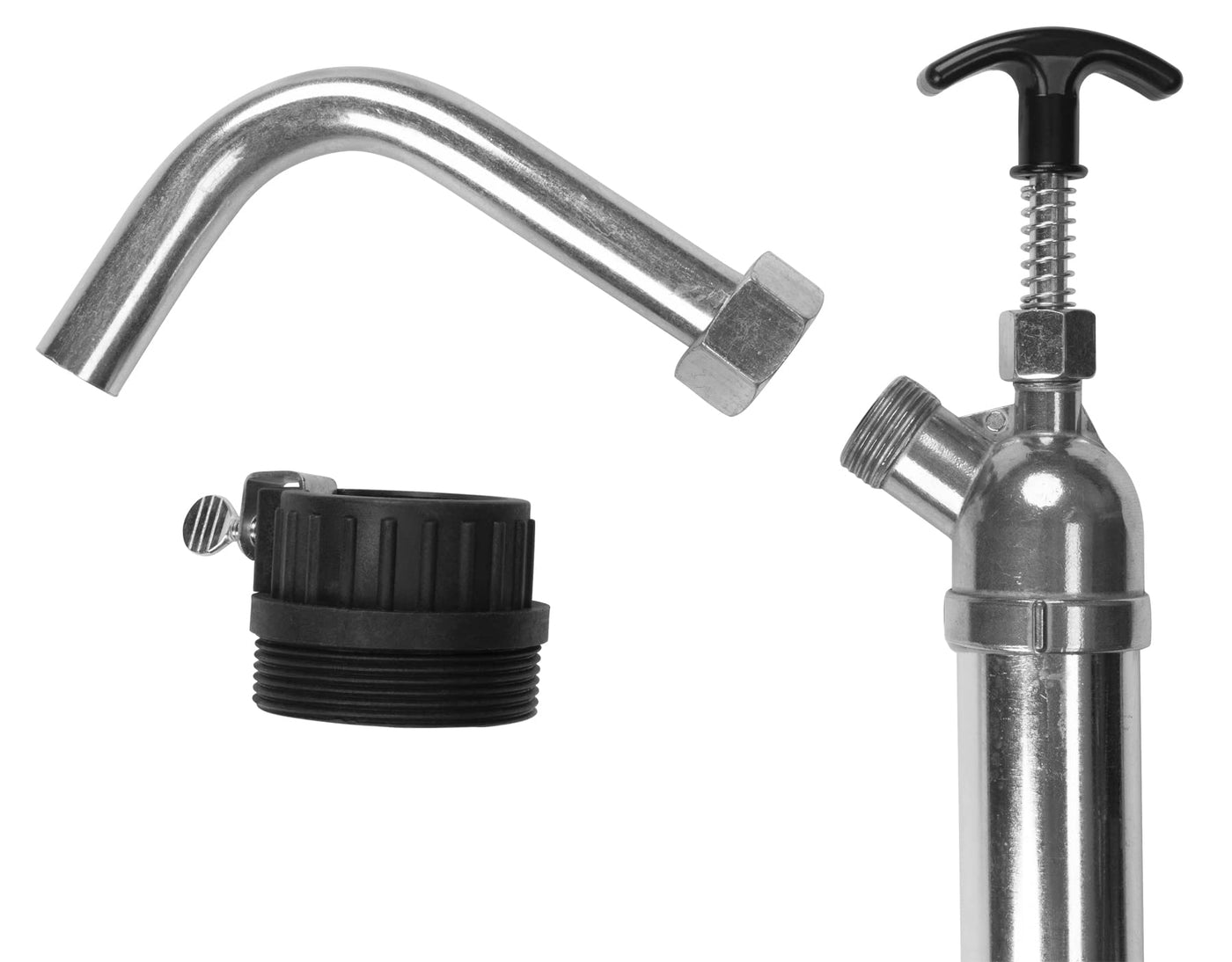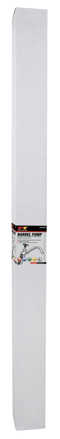 The Performance Tool barrel pump dispenser is designed to provide reliable and efficient fluid transfer in a variety of industrial settings. Built with a sturdy 18-gauge steel cylinder and a die-cast head with garden hose threads, this pump is built to last and provide reliable performance over time. With its lift action design, this pump can quickly and easily transfer fluids from barrels, drums, and other containers with ease. The included curved metal spout and adapter make it easy to connect to a variety of containers, while the ergonomic handle provides comfortable and easy pumping. Suitable for use with a wide range of fluids, including oils, gasoline, diesel, and other non-corrosive fluids, this pump is a versatile and convenient tool for any industrial setting. Lightweight and easy to maneuver, this barrel pump dispenser is perfect for use in workshops, garages, and other industrial settings where efficient fluid transfer is required.