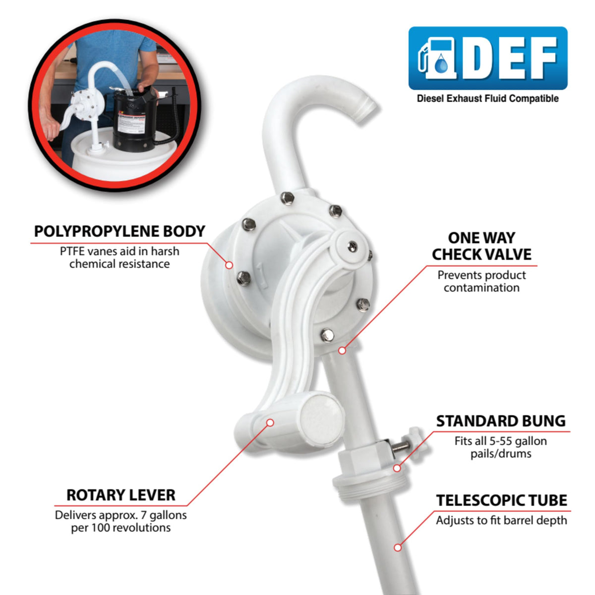 This professional rotary barrel pump is ideal for DEF (Diesel Exhaust Fluid) applications, making it a perfect addition to shops for serious vehicle maintenance workers. Great for pumping gasoline, diesel, machine oil, alcohol, acidic fluids, and more, this pump will be in regular use in maintenance bays and garages.