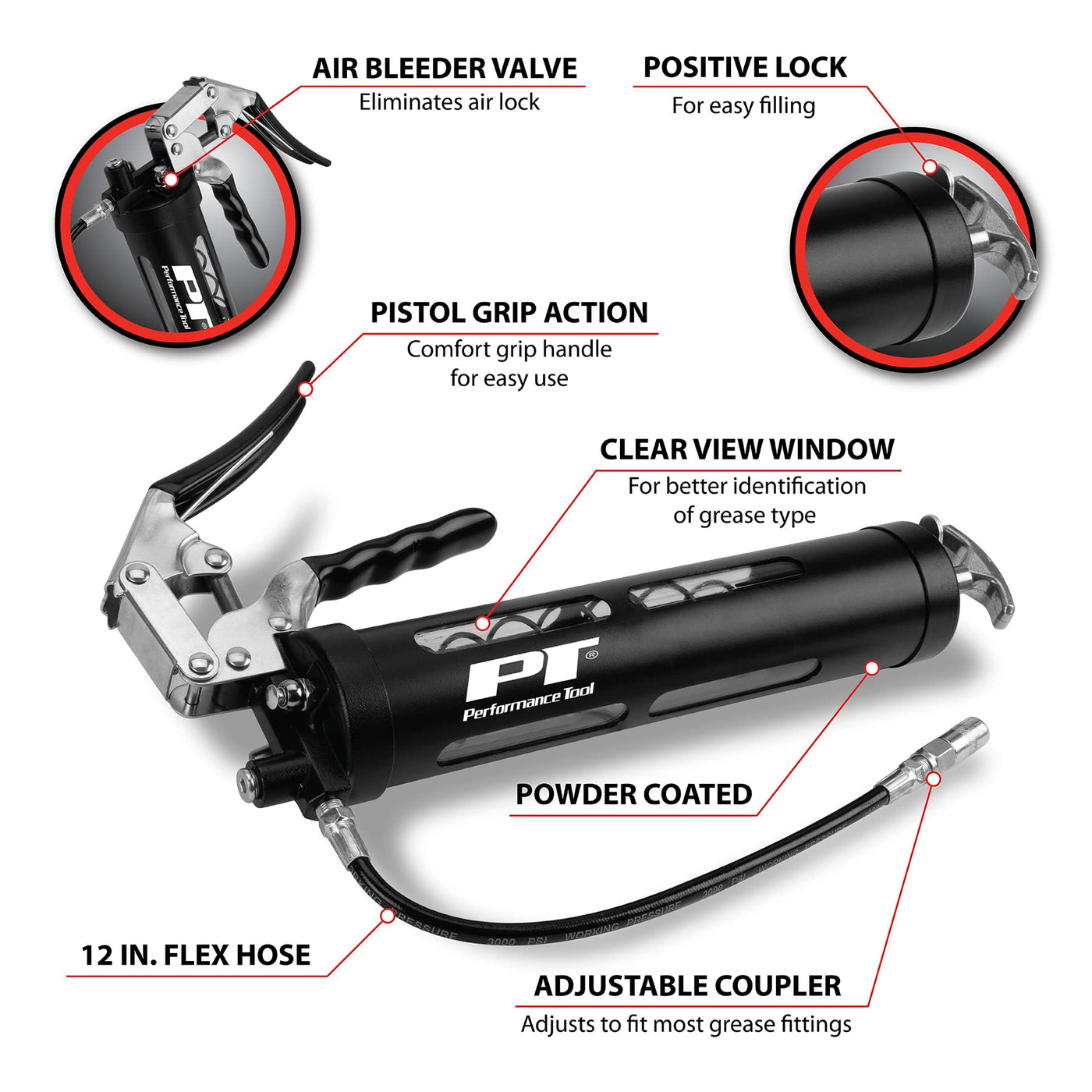 Performance Tool W54294 Clear View Pistol Action Manual Grease Gun With 12-Inch Wipe Hose And Coupler
