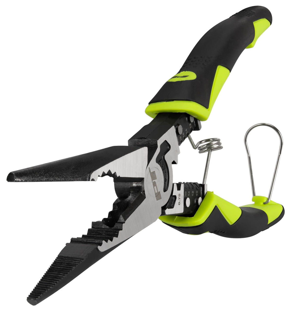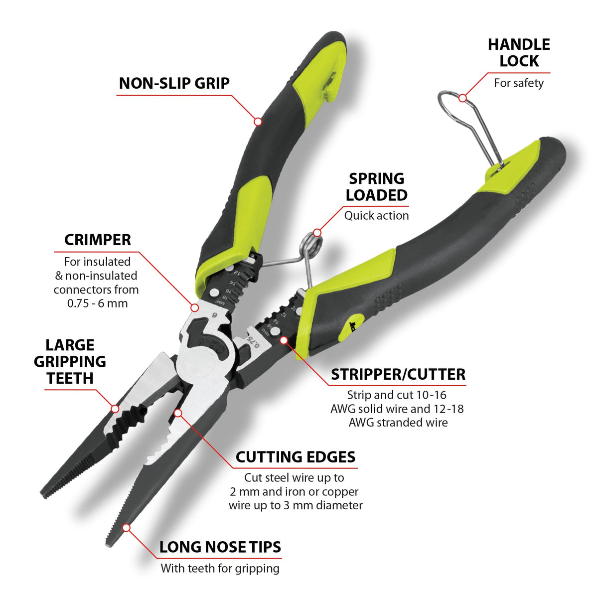 The Performance Tool W86507 8-1/2 inch Multifunction Long Nose Pliers are versatile tools for electrical projects. With hardened cutting edges, they cut steel wire up to 2 mm diameter and strip 10-16 AWG solid wire and 12-18 AWG stranded wire. They also crimp insulated and non-insulated connectors from 0.75-6 mm. Constructed from professional-grade forged Cr-V steel.