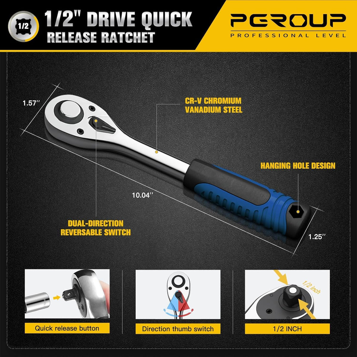Q: How does the ratchet mechanism improve efficiency during use?A: The ratchet handle features a quick release button and an ergonomic design, allowing for easy socket changes and efficient tightening or loosening of bolts without removing the socket, thus saving time during projects.